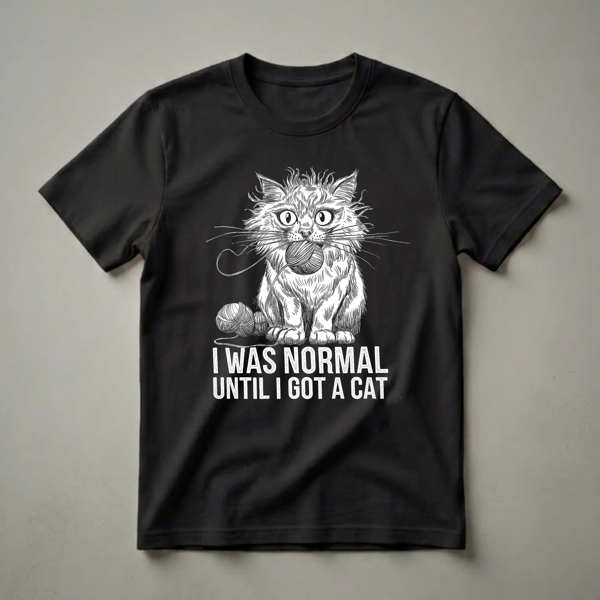 Cat moms and cat dads know that life changes dramatically once a feline friend enters the home. This graphic t-shirt captures that sentiment with a whimsical, hand-drawn illustration of a fluffy cat looking slightly bewildered, its mouth full of yarn. Beside it, more balls of yarn suggest a playful, perhaps chaotic, scene. The bold white text below reads, "I WAS NORMAL UNTIL I GOT A CAT," a relatable declaration for anyone who has experienced the unique joys and quirks of living with a cat. Cats, known for their independent yet affectionate nature, often bring an unexpected level of entertainment and personality into a household. This tee is a testament to that transformation, celebrating the way cats can turn a quiet life into an adventure. It's a thoughtful gift for the cat lady in your life or any cat owner who understands that their furry companion is the true center of their universe. Wear this shirt to your next casual outing, a cat cafe visit, or simply while lounging at home with your beloved pet.