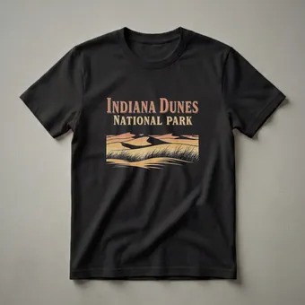 Indiana Dunes National Park visitors who appreciate the unique landscape will reach for this retro graphic tee. The design features rolling sand dunes bathed in a warm sunset glow, with silhouetted tall grasses in the foreground. This iconic park, located along the southern shore of Lake Michigan in Indiana, is renowned for its diverse ecosystems, including its impressive sand dunes that are among the largest in the world. These dunes are a result of glacial activity and wind deposition over thousands of years, creating a dynamic and ever-changing environment. This shirt captures the essence of exploring the park's sandy trails and enjoying its breathtaking views. It makes a thoughtful gift for anyone who has hiked its paths, camped under its stars, or simply cherishes the natural beauty of the Indiana shoreline. Wear this comfortable t-shirt on your next outdoor adventure or as a reminder of your favorite national park destination. It's a staple for any outdoor enthusiast's wardrobe, suitable for casual wear or active exploration.