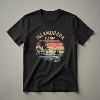 Islamorada, Florida, a vibrant part of the Florida Keys, beckons with its unique charm and abundant fishing opportunities. This retro-inspired graphic tee captures the essence of this island paradise. The design features a striking sunset with a vibrant color palette of orange, yellow, and red, layered with a distressed texture that evokes a vintage feel. Silhouetted palm trees stand tall against the horizon, hinting at the tropical landscape. A lone sailboat glides across the water, while a powerful fish leaps from the waves, symbolizing the renowned sport fishing that Islamorada is famous for. This shirt is a thoughtful gift for anyone who cherishes memories of the Florida Keys or dreams of experiencing its laid-back atmosphere and world-class angling. Wear this t-shirt to your next fishing trip, a casual day out, or while reminiscing about your Florida adventures. It's a staple for any traveler's collection.