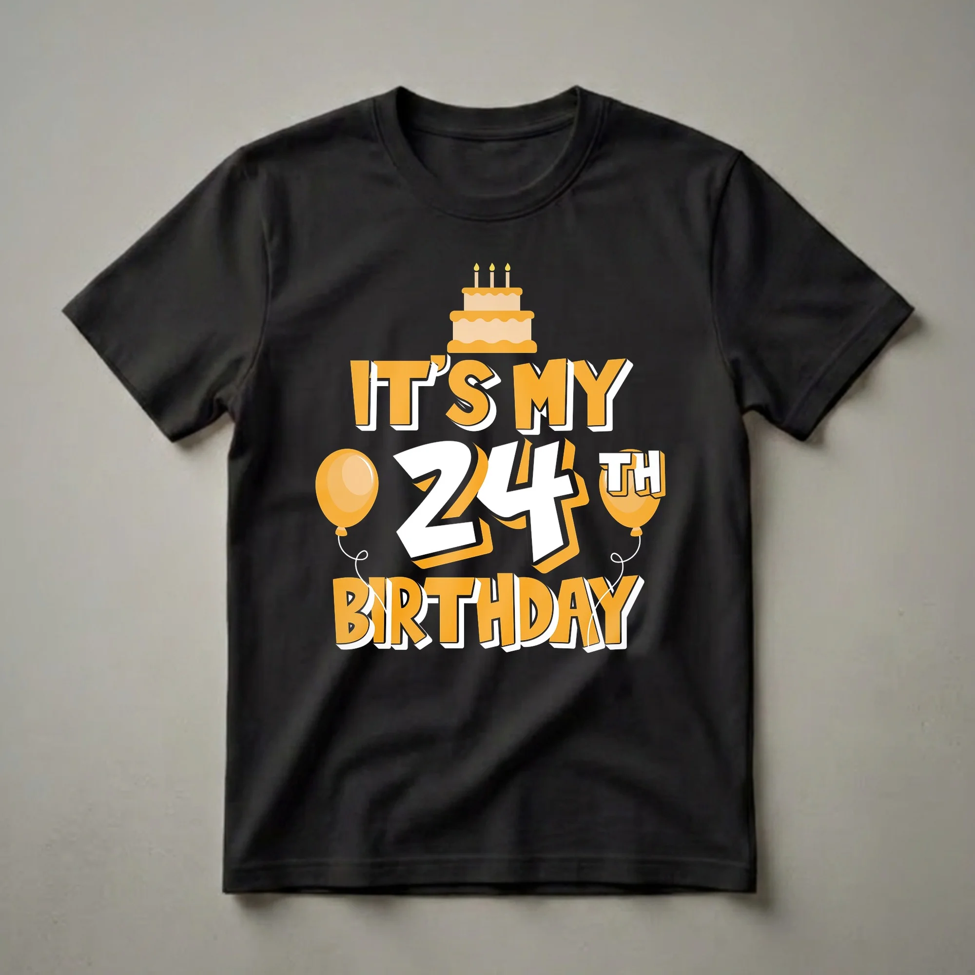 Celebrate your 24th birthday in style with this festive graphic t-shirt featuring bold text and celebratory birthday graphics.This vibrant graphic tee captures the celebratory spirit of such an occasion. The design prominently displays bold, orange and white lettering that reads "IT'S MY 24TH BIRTHDAY." Above the text sits a cheerful two-tiered birthday cake topped with three lit candles, symbolizing wishes and celebration. Flanking the large "24" are two bright orange balloons, adding a festive touch. This shirt is a fantastic way for anyone celebrating their 24th birthday to express their excitement. It's a thoughtful gift idea for a son, daughter, friend, or sibling who is reaching this age. Imagine them wearing this t-shirt to their birthday party, brunch, or any gathering with friends and family. The graphic is eye-catching and clearly communicates the special day. This tee works well for anyone who wants to make their 24th birthday memorable and fun, whether they are planning a big bash or a quiet celebration. It's a staple piece for any birthday wardrobe, ensuring the birthday person stands out.