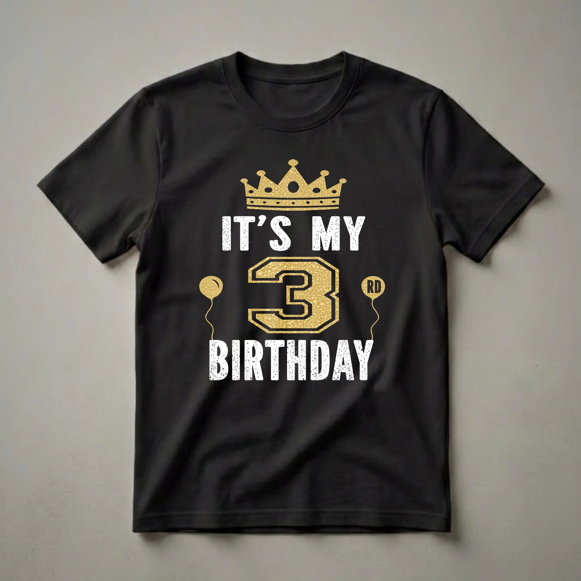 Celebrate your little one's big day with this fun graphic t-shirt featuring a golden crown, sparkling number three, and festive balloons. This vibrant graphic t-shirt captures the excitement of turning three with a bold, celebratory design. At the top, a shimmering golden crown sits proudly, symbolizing the birthday child as the king or queen of their special day. Below the crown, the words "IT'S MY" are emblazoned in a distressed white font, creating a vintage feel. The centerpiece is a large, stylized number "3" filled with a sparkling golden texture, outlined in black, signifying the age. To the sides of the number, two golden balloons add a festive touch, with one featuring the "RD" suffix in black, completing the "3rd" designation. The word "BIRTHDAY" is printed below in a matching distressed white font, reinforcing the celebratory theme. This shirt is a thoughtful gift for any child turning three, whether it's for a birthday party, a family gathering, or just to make their special day even more memorable. It's a fun way for a 3-year-old to express their excitement about their birthday and wear it proudly throughout their celebration. This eye-catching tee is sure to be a hit with the birthday boy or girl.