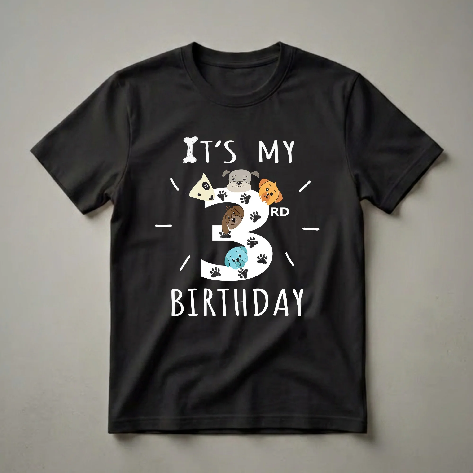 Three-year-olds who adore puppies will reach for this playful birthday tee. The design prominently features a large, stylized number '3' that serves as a canvas for a charming collection of diverse dog faces, including a golden retriever, a pug, a beagle, and a blue-nosed pup. Each canine friend peeks out from behind or within the number, surrounded by scattered black paw prints, adding a whimsical touch. Above the '3', bold white lettering declares 'IT'S MY', with a playful bone graphic replacing the apostrophe. Below, 'BIRTHDAY' is written in a similar friendly font. This t-shirt is a fantastic way for a child celebrating their third birthday to showcase their love for dogs. It makes a thoughtful gift for any toddler who is fascinated by puppies and all things canine. Imagine the birthday girl or boy wearing this shirt to their party, surrounded by friends and family, ready to celebrate another year of fun and discovery. This shirt is a wonderful keepsake for a 3rd birthday, capturing the joy and excitement of this special milestone.