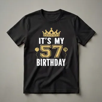 Turning 57 marks a significant milestone, a time to celebrate a life well-lived and look forward to new adventures. This graphic tee is suited for individuals celebrating their 57th birthday, whether they are men or women. The design prominently features a regal golden crown, symbolizing royalty and achievement, alongside festive golden balloons and the bold text 'IT'S MY 57TH BIRTHDAY'. The number '57' is rendered in a textured gold, making it a striking visual centerpiece. The distressed white font for 'IT'S MY' and 'BIRTHDAY' adds a touch of vintage flair to this celebratory apparel. This t-shirt works well for anyone reaching this special age, offering a fun way to announce their milestone. It makes a thoughtful gift for a father, mother, spouse, or friend who is turning 57. Imagine them wearing this shirt to their birthday dinner, a party, or a casual brunch with loved ones, sharing their joy and pride. This shirt is a fantastic way to commemorate 57 years of memories and experiences, making the birthday person feel celebrated and special on their big day. It's a staple in any birthday collection for those entering their late fifties.