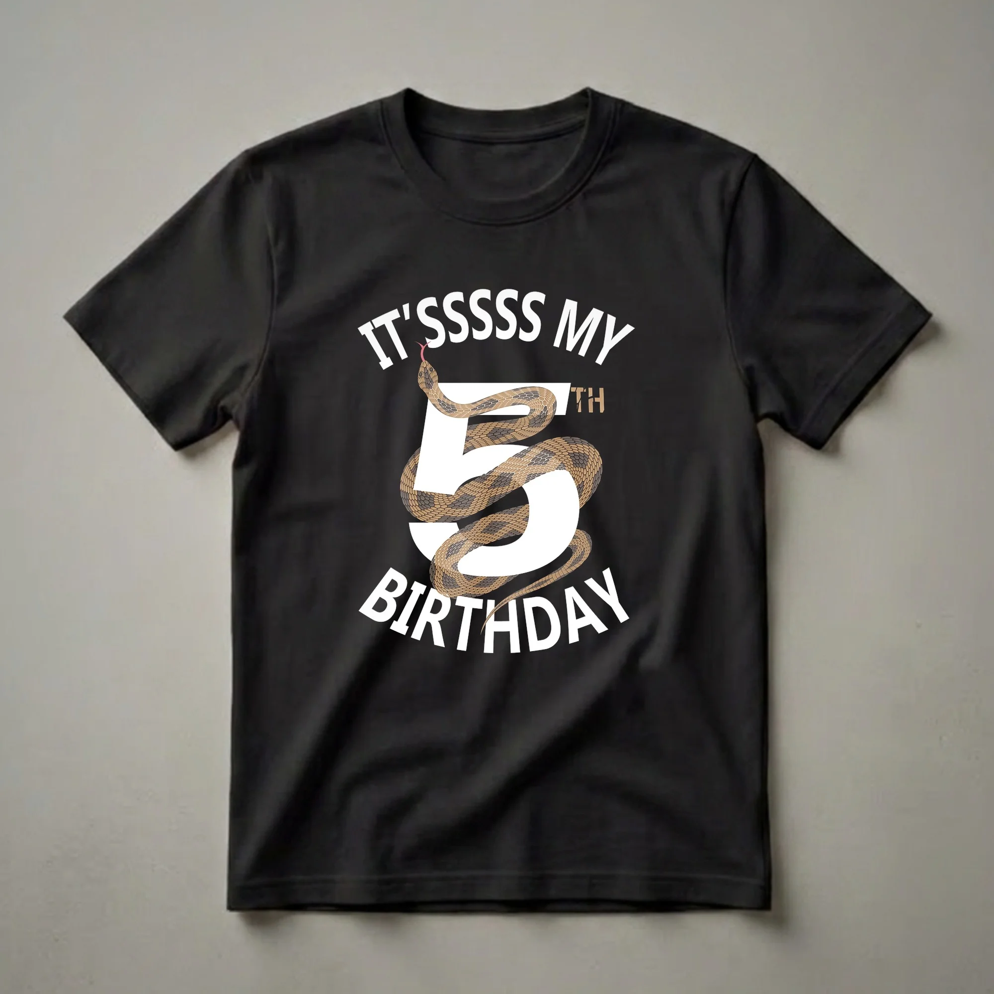 Five-year-olds are entering a stage of imaginative play and growing independence, making their birthday a significant milestone. This striking graphic tee captures that excitement with a bold design featuring a coiled snake. The text "IT'SSSSS MY 5TH BIRTHDAY" is prominently displayed, with the "5" entwined by a detailed illustration of a brown and tan snake, complete with a flicking red tongue. Snakes, like the common garter snake often found in North American gardens and woodlands, are fascinating creatures known for their unique patterns and movements. This shirt is a thoughtful gift for any child turning five who has an interest in reptiles, nature, or simply enjoys a cool, edgy design. It's a fantastic t-shirt to wear to a birthday party, a casual playdate, or even just around the house. The unique snake graphic makes this birthday shirt stand out, ensuring the birthday boy or girl feels special on their big day. This apparel is a fun way for a 5-year-old to express their personality and celebrate turning five.