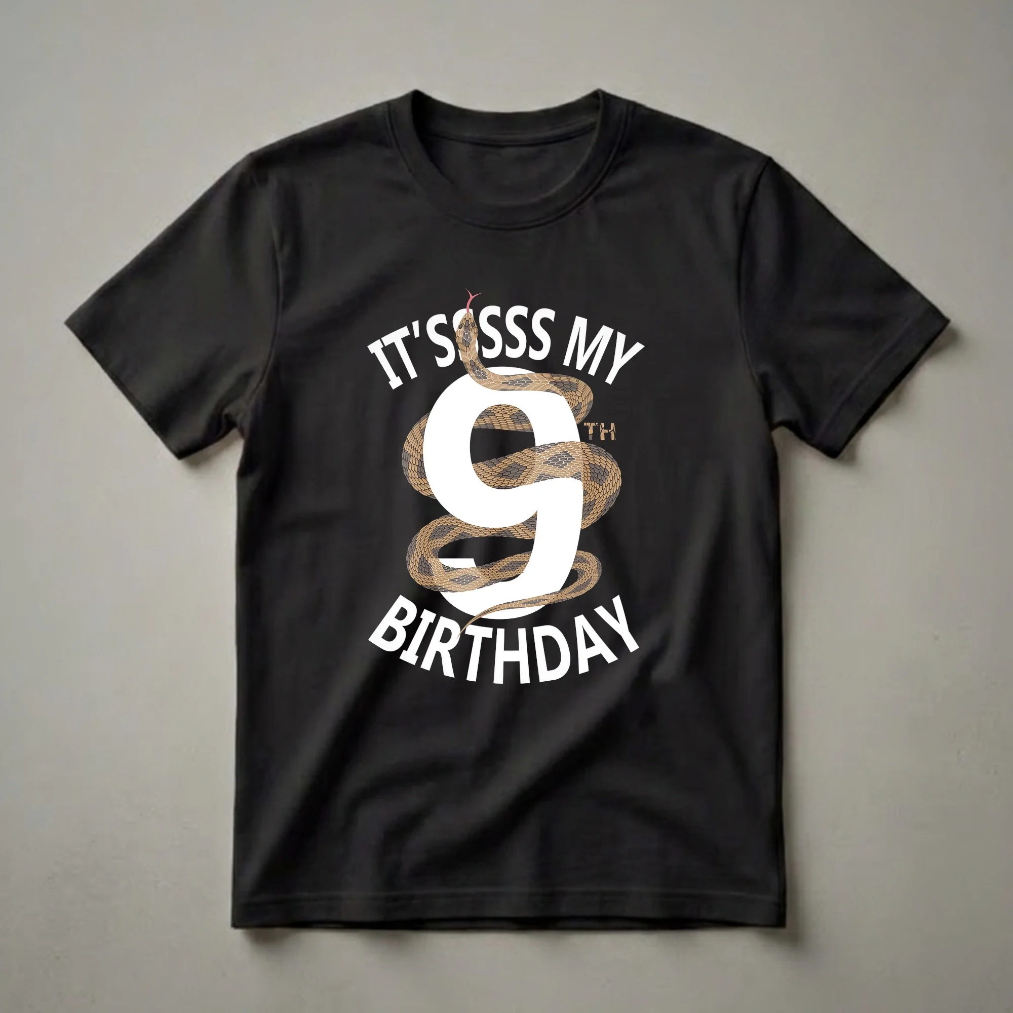 Nine-year-olds are entering a fascinating stage of childhood, exploring new interests and developing their unique personalities. This graphic tee is designed to celebrate that milestone with a playful and eye-catching design. The shirt features a large, bold white number '9', signifying the big nine. Coiled around the number is a detailed illustration of a snake, complete with intricate scales in shades of brown and grey, and a forked tongue flicking out. The text "IT'S SSSS MY BIRTHDAY" is emblazoned above and below the graphic, with the 'SSSS' playfully mimicking a snake's hiss. This t-shirt is a fantastic way for any child turning nine to express their excitement for their special day. It's a thoughtful gift idea for parents, grandparents, aunts, or uncles looking for a unique present for the birthday boy or girl. This shirt works well for birthday parties, family gatherings, or just as a fun everyday tee for kids who love reptiles or unique designs. The snake motif adds an element of cool, making this shirt a go-to choice for any nine-year-old who wants to stand out.