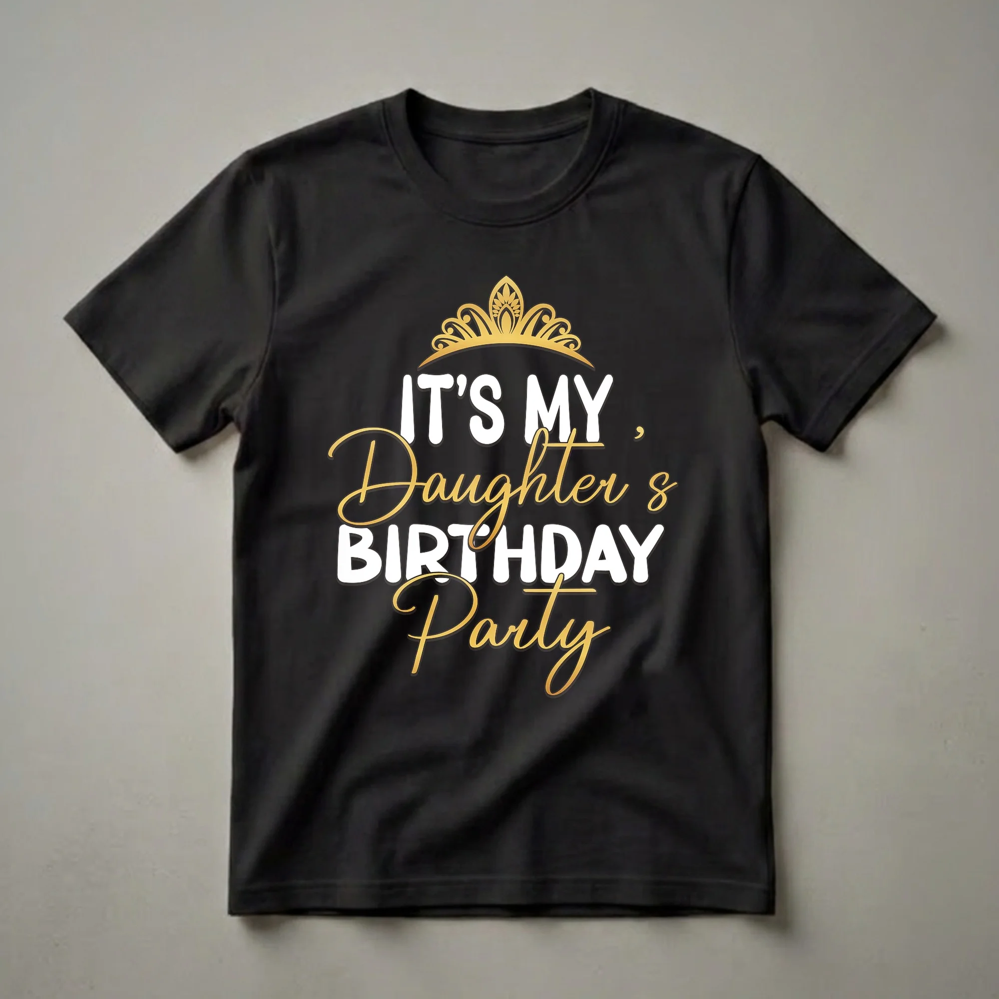 Proud parents celebrating their daughter's birthday party will love this graphic tee. The design features a regal gold crown atop bold white text that reads 'IT'S MY DAUGHTER'S BIRTHDAY PARTY'. Below, the words 'Daughter's' and 'Party' are rendered in an elegant, flowing gold script, creating a striking contrast against the black shirt. This t-shirt is a thoughtful gift for any parent who wants to commemorate their child's special day. It's a fun way to show family unity and pride during birthday celebrations, whether at a party, a family gathering, or a special outing. This shirt works well for moms and dads alike, making it a versatile addition to any birthday attire. Imagine the smiles and photos captured while wearing this matching shirt, a perfect memento of a cherished milestone. This tee is a staple for any parent looking to make their daughter's birthday extra memorable and visually coordinated. It's a wonderful way to mark the occasion.