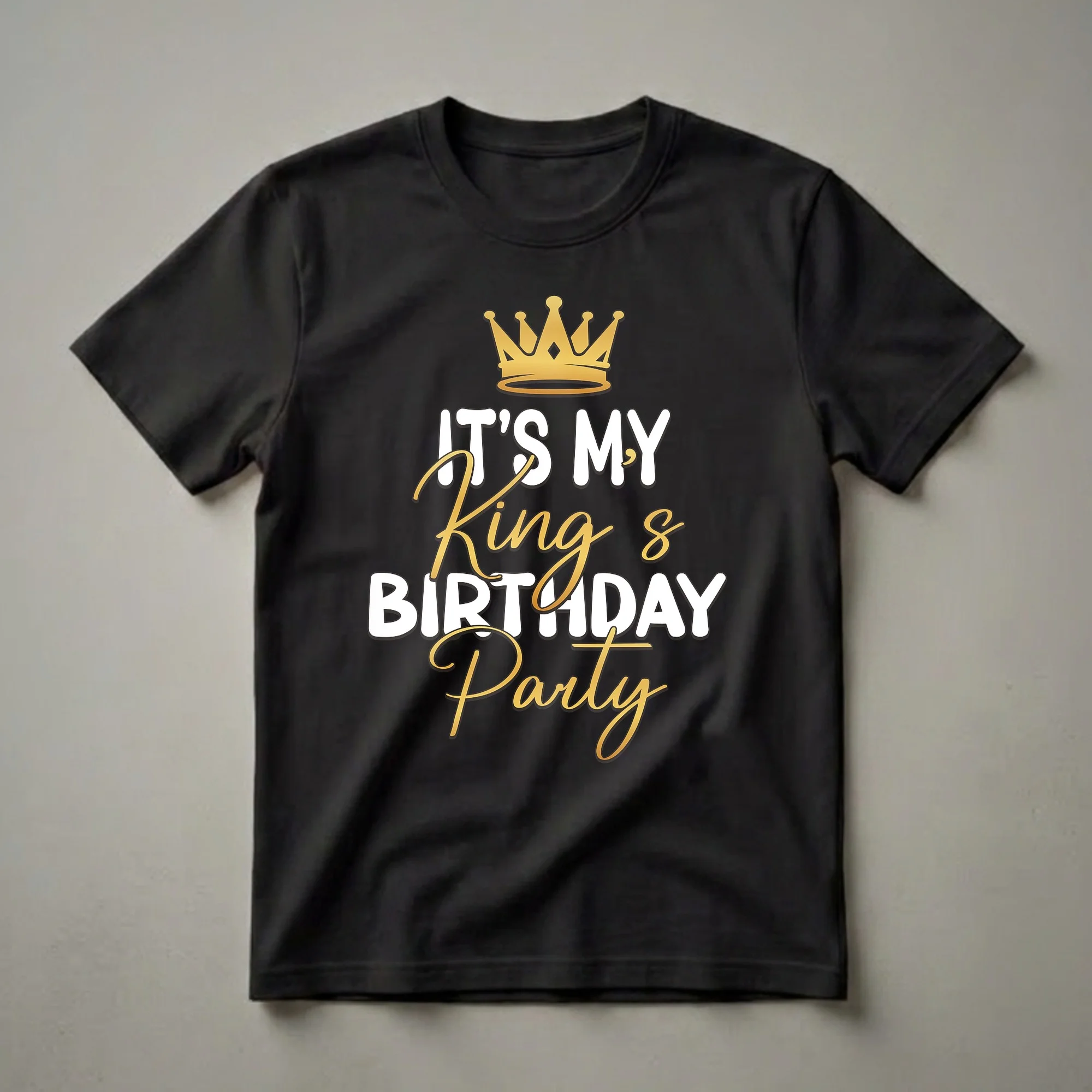 - Features a golden crown and "It's My King's Birthday Party" text.