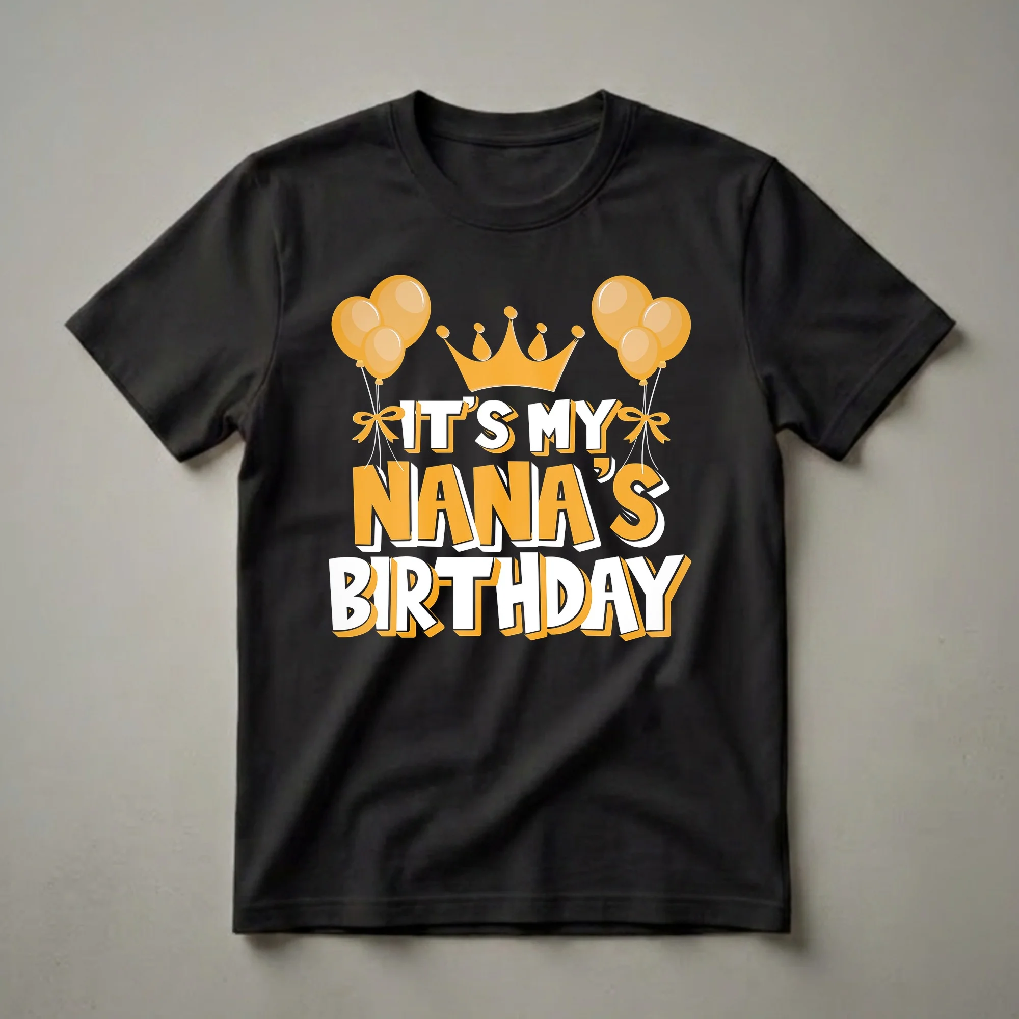 - Features a festive design with 'IT'S MY NANA'S BIRTHDAY' text, a crown, and balloons.