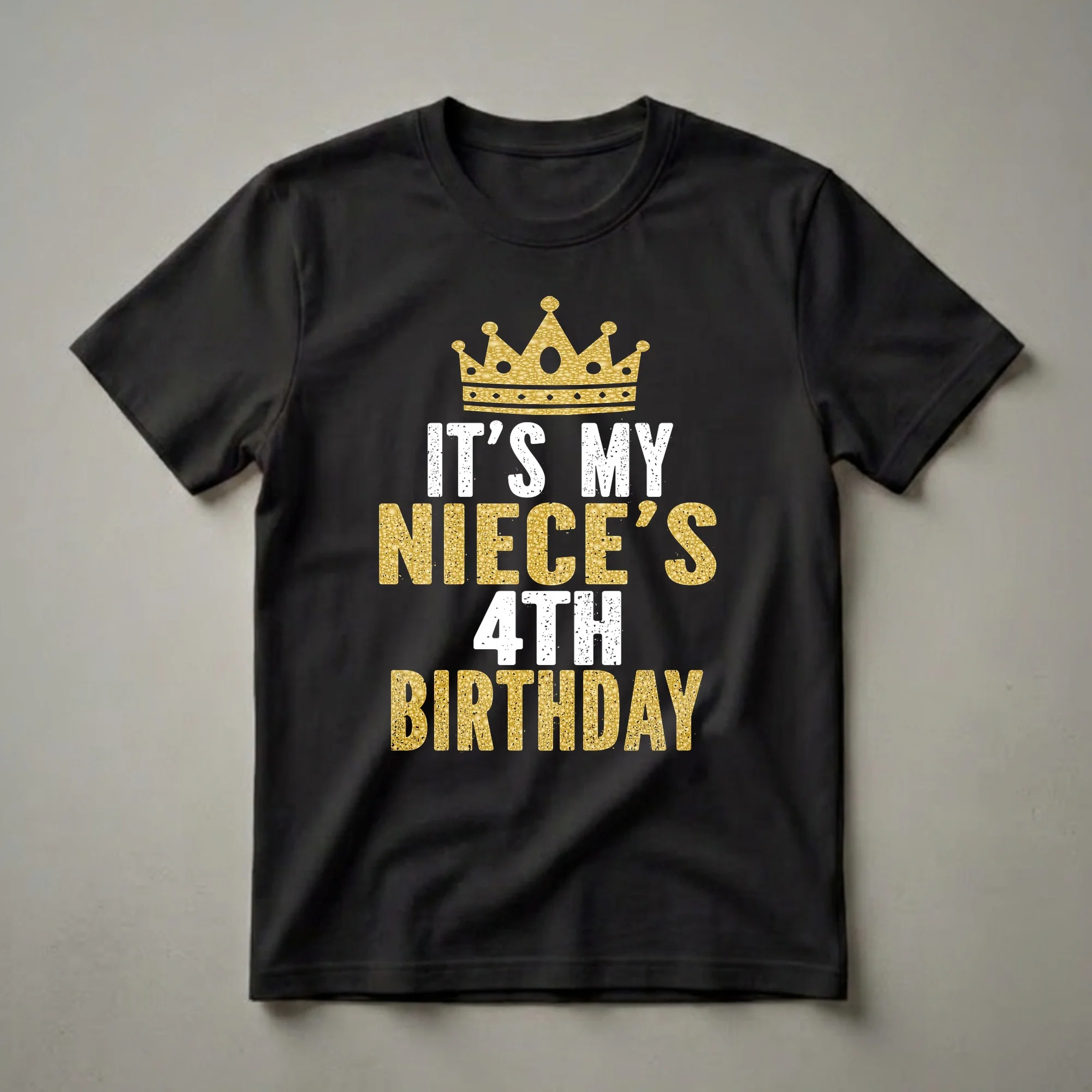 Four-year-olds are entering a vibrant stage of imaginative play and growing independence, making their birthday a significant milestone. This graphic tee captures the celebratory spirit for a niece turning four. The design features a dazzling gold crown, symbolizing royalty and the special status of the birthday girl. Below the crown, bold text announces 'IT'S MY NIECE'S 4TH BIRTHDAY.' The words 'IT'S MY' and '4TH' are rendered in a distressed white font, while 'NIECE'S' and 'BIRTHDAY' are presented in a shimmering gold texture, mimicking the sparkle of confetti or glitter. This shirt is a wonderful way for aunts and uncles to show their love and participate in the family matching theme for the celebration. It’s a thoughtful gift idea for any aunt or uncle who wants to wear their pride on their sleeve. This tee works well for birthday parties, family gatherings, or even just casual wear leading up to the big day. Imagine the joy of seeing the whole family sporting matching shirts as they celebrate the special four-year-old.