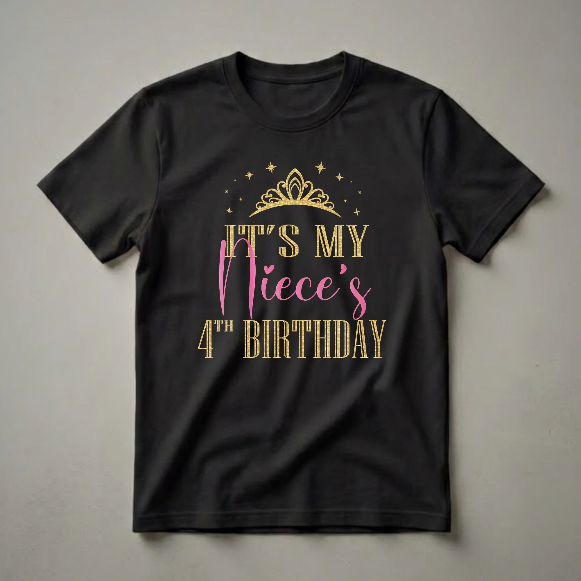 Celebrate your favorite little queen's fourth birthday with this matching family tee featuring a regal crown and sparkling gold and pink text. The design features a golden crown with sparkling stars above the text "IT'S MY Niece's 4TH BIRTHDAY." The words "IT'S MY" and "4TH BIRTHDAY" are rendered in a bold, textured gold font, while "Niece's" is written in a playful, flowing pink script, complete with a small pink heart. This shirt is a wonderful way for family members to show their love and participate in the birthday festivities. Turning four is a significant milestone, marking a child's transition into early childhood with growing independence and imagination. This t-shirt makes a thoughtful gift for any aunt or uncle looking to coordinate with their niece for her birthday party, family photos, or a special celebration. It's a comfortable and stylish way to express family pride and join in the birthday joy. Wear this tee to the birthday party to make the celebration even more memorable.