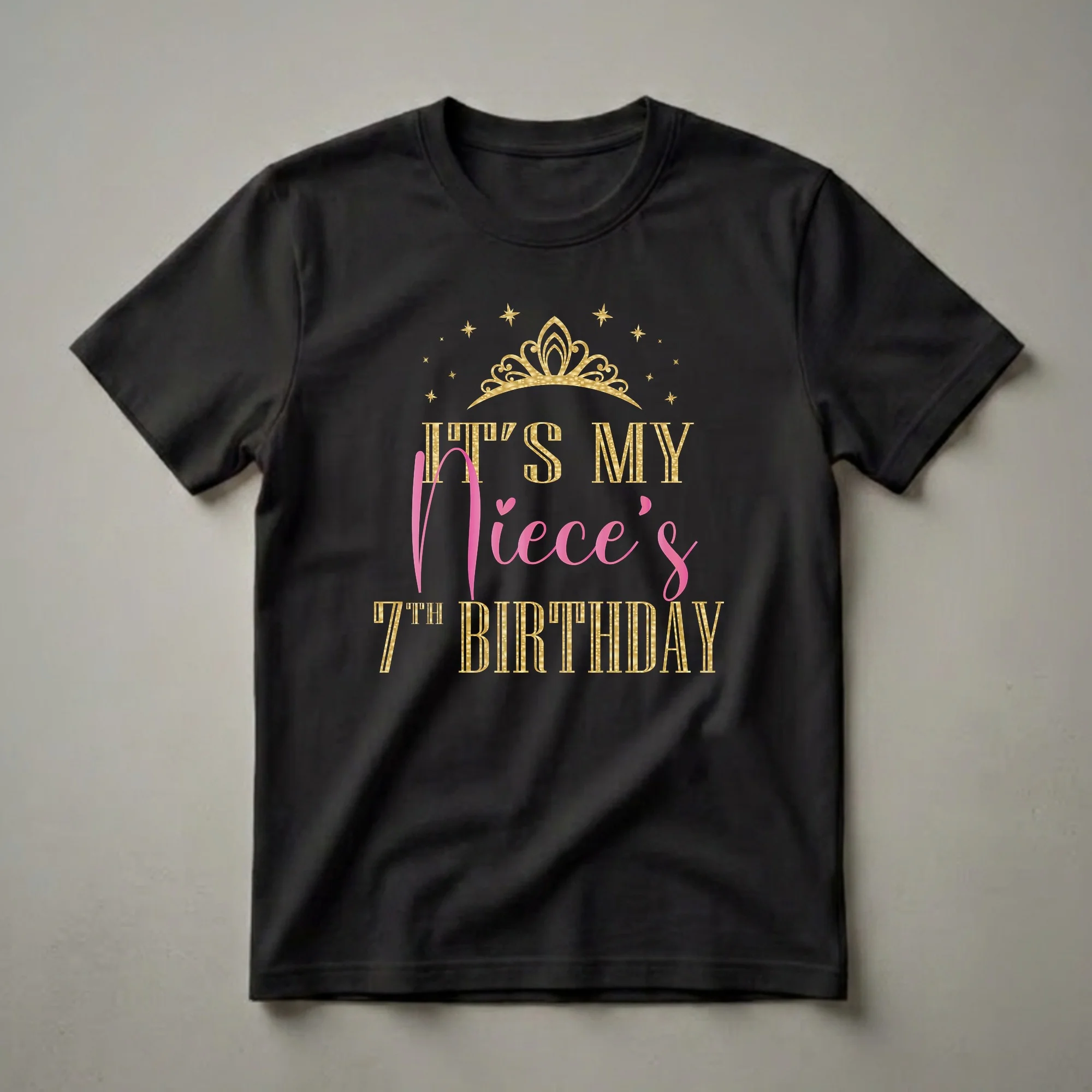 Celebrate your niece's 7th birthday with this regal graphic t-shirt featuring a shimmering gold crown and festive pink and gold lettering. This eye-catching graphic tee is designed to celebrate your niece's 7th birthday in style. The design features a golden crown atop sparkling gold lettering that reads "IT'S MY NIECE'S" in a playful pink script. Below, "7TH BIRTHDAY" is emblazoned in more glittering gold text, surrounded by scattered gold stars. This shirt is a wonderful way for aunts and uncles to show their love and celebrate this milestone. Imagine the joy on your niece's face when she sees this special birthday shirt, a perfect addition to her party attire. It's a thoughtful gift idea for any aunt or uncle looking to make their niece's 7th birthday celebration even more memorable. This tee works well for birthday parties, family gatherings, or as a special keepsake. The matching family aspect means everyone can join in the festive spirit, creating wonderful photo opportunities. This t-shirt is a fantastic way to honor her special day and create lasting memories.