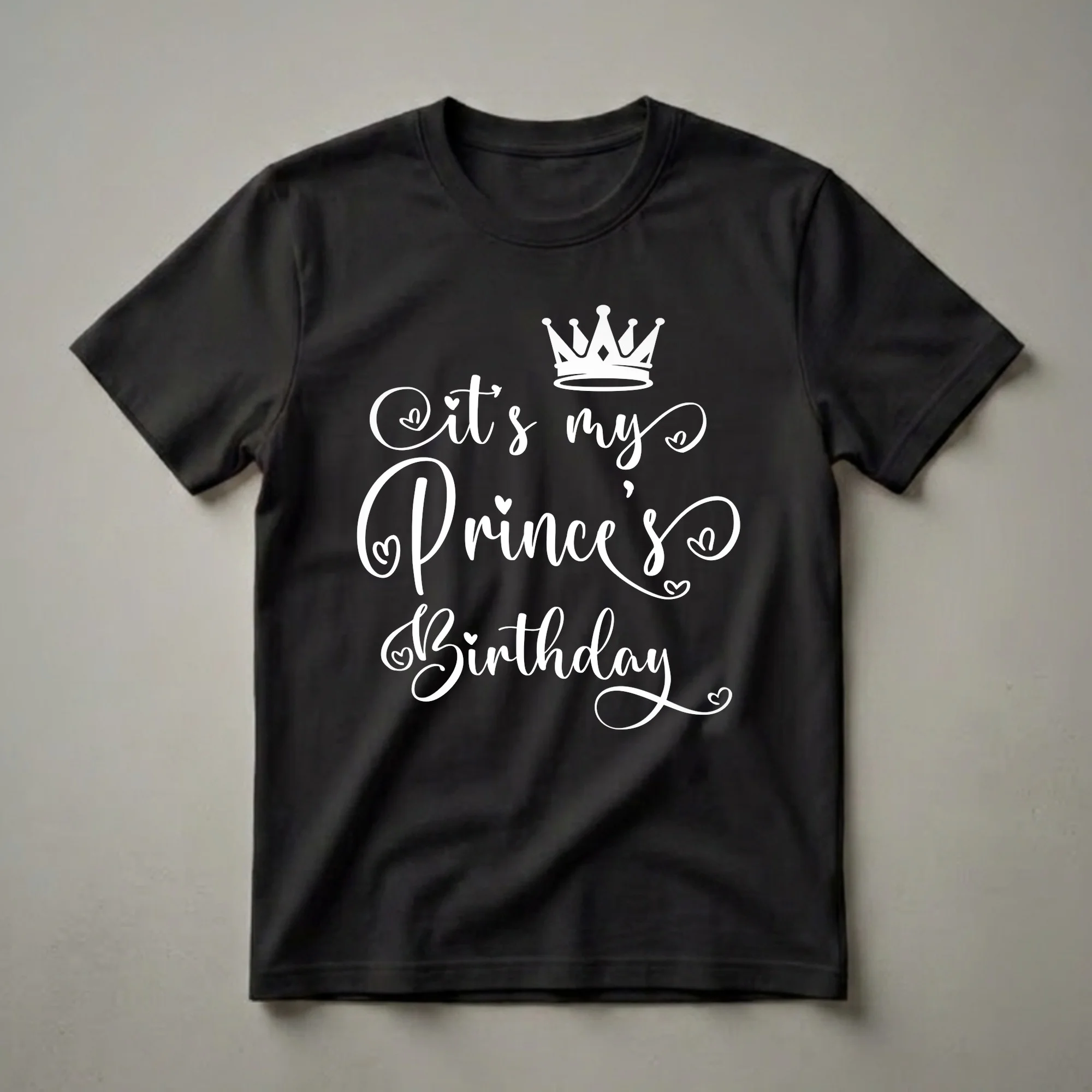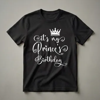 For the parent who wants to celebrate their little one's special day in style, this 'It's My Prince's Birthday' graphic tee is a fantastic choice. The design features elegant white script lettering that reads 'it's my Prince's Birthday,' topped with a regal crown graphic. This shirt is a thoughtful choice for moms or dads who want to coordinate with their birthday boy or girl, creating memorable family photos. Birthdays are milestones, marking another year of growth and joy, and this t-shirt helps you join in the celebration. Imagine wearing this tee while watching your prince blow out his candles or open presents. It's a thoughtful gift for any parent of a young boy turning a milestone age, whether it's his first birthday or his fifth. This comfortable shirt makes a thoughtful gift for any parent of a young boy turning a milestone age, whether it's his first birthday or his fifth. It's a staple for any parent looking to make their child's birthday extra special.