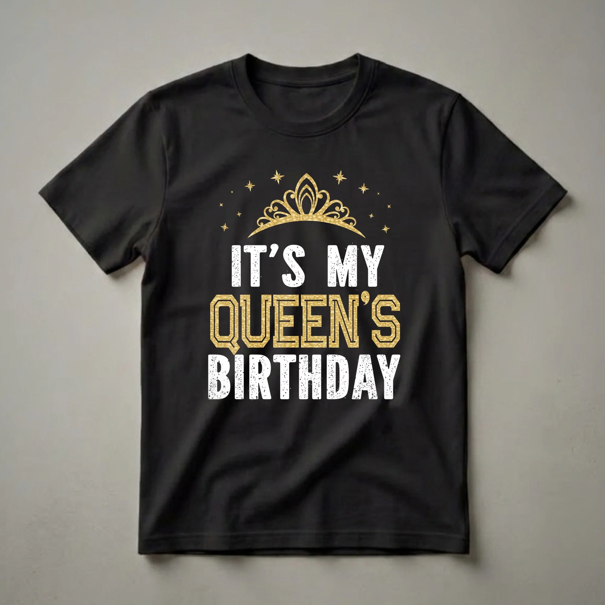 Queen's birthday celebrations call for coordinated family apparel, and this graphic tee delivers. The design features a striking golden crown adorned with sparkling stars, set against a bold black background. The text prominently reads "IT'S MY QUEEN'S BIRTHDAY" in a distressed white font for the top and middle lines, while "QUEEN'S" is rendered in a luxurious, textured gold. This shirt is a thoughtful gift for the birthday queen, allowing her to feel celebrated and regal on her special day. It's also a fantastic way for family members to show their love and unity during birthday festivities. Imagine the joy and photo opportunities when the whole family sports these matching shirts at a birthday brunch or party. This tee is a staple for any family looking to make a birthday event even more memorable and visually cohesive. It’s a fun way to honor the queen of the celebration and create lasting memories.