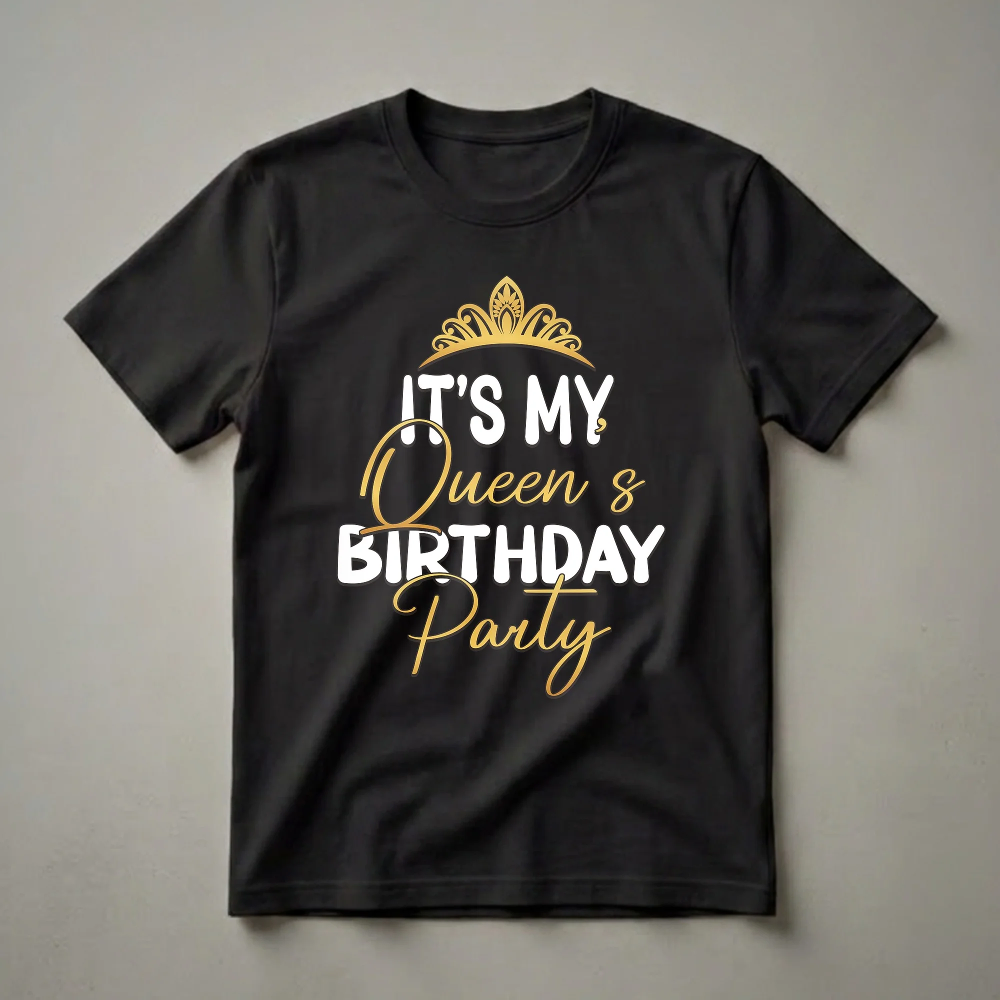 The birthday girl will feel like royalty with this 'It's My Queen's Birthday Party' graphic tee. The design features a striking golden crown positioned above bold white lettering that reads 'IT'S MY'. Below this, the word 'Queen' is written in elegant, flowing gold script, followed by 'BIRTHDAY' in large white block letters. The word 'Party' is also in a stylish gold script, completing the celebratory message. This t-shirt is a fantastic way for the birthday queen to announce her special day and is a staple for any birthday celebration. It's a thoughtful gift for any woman who loves to be the center of attention on her birthday. Imagine her wearing this shirt to her birthday brunch or party, making the occasion even more memorable. This shirt is a go-to tee for anyone celebrating a special birthday milestone and wanting to share their joy with everyone around them. It’s a fun way to mark the occasion and create lasting memories.