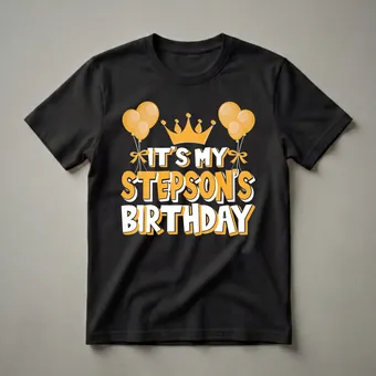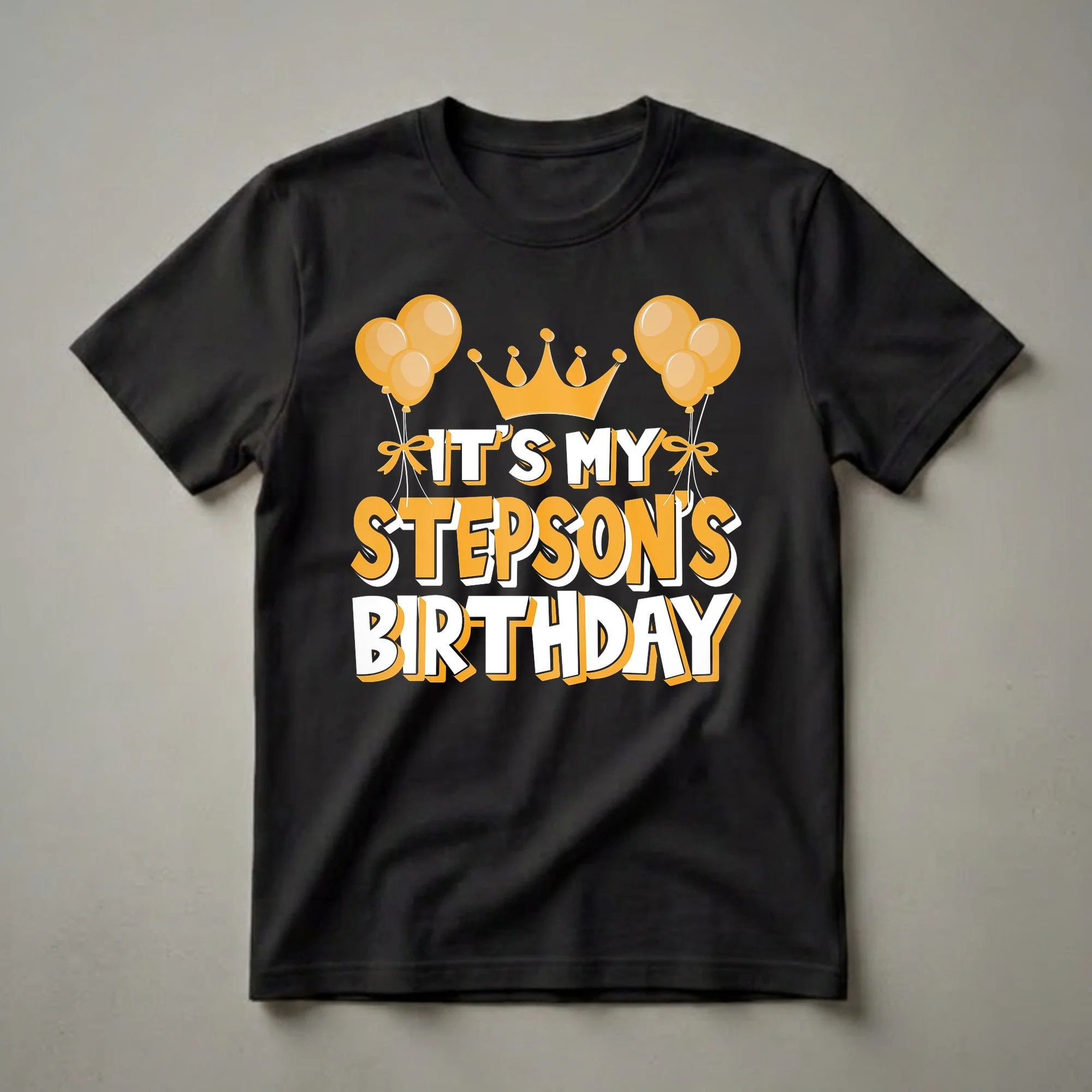 Step-parents can now celebrate their stepson's special day in style with this festive graphic t-shirt. The design prominently features bold, eye-catching text that reads "IT'S MY STEPSON'S BIRTHDAY" in a vibrant orange and white color scheme, outlined with a dark shadow for a striking effect. Above the main text sits a regal golden crown, symbolizing the importance of the occasion. Flanking the crown are clusters of bright orange balloons, tied with ribbons and bows, adding a celebratory atmosphere. This shirt is a fantastic way for the whole family to join in the birthday fun, especially if you're looking for family matching outfits. It makes a thoughtful gift for any stepdad or stepmom wanting to show their love and support for their stepson's milestone. Imagine the joy on his face when he sees his family wearing matching shirts to celebrate him. This tee is great to wear to birthday parties, family gatherings, or any event dedicated to honoring the birthday boy. It's a fun and direct way to express pride and love on his big day, making the celebration even more special and memorable for everyone involved.