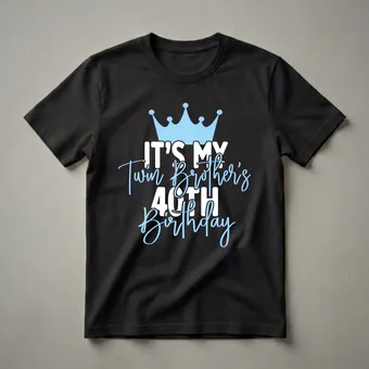 Turning 40 is a significant milestone, and what better way to celebrate your twin brother than with a shirt that announces the occasion? This graphic tee features a prominent light blue crown, symbolizing royalty and the importance of the day. Below the crown, the text "IT'S MY Twin Brother's 40TH Birthday" is displayed in a mix of bold white lettering and a flowing light blue script. This design is a direct and celebratory statement, a thoughtful choice for anyone looking to acknowledge their twin's big day. This shirt is a thoughtful gift for a sister or brother who wants to show their twin some love on their 40th. It's a fun way to make the birthday person feel special at any celebration, whether it's a casual get-together or a larger party. The visual contrast between the white and light blue text against a darker shirt background makes the message pop. This t-shirt is a staple for any sibling wanting to join in the birthday festivities. It's a conversation starter and a clear declaration of sibling pride on a landmark birthday. This apparel is a go-to tee for anyone celebrating a twin's entry into their fifth decade.