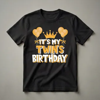 - Features bold "IT'S MY TWIN'S BIRTHDAY" text with a crown and balloons.