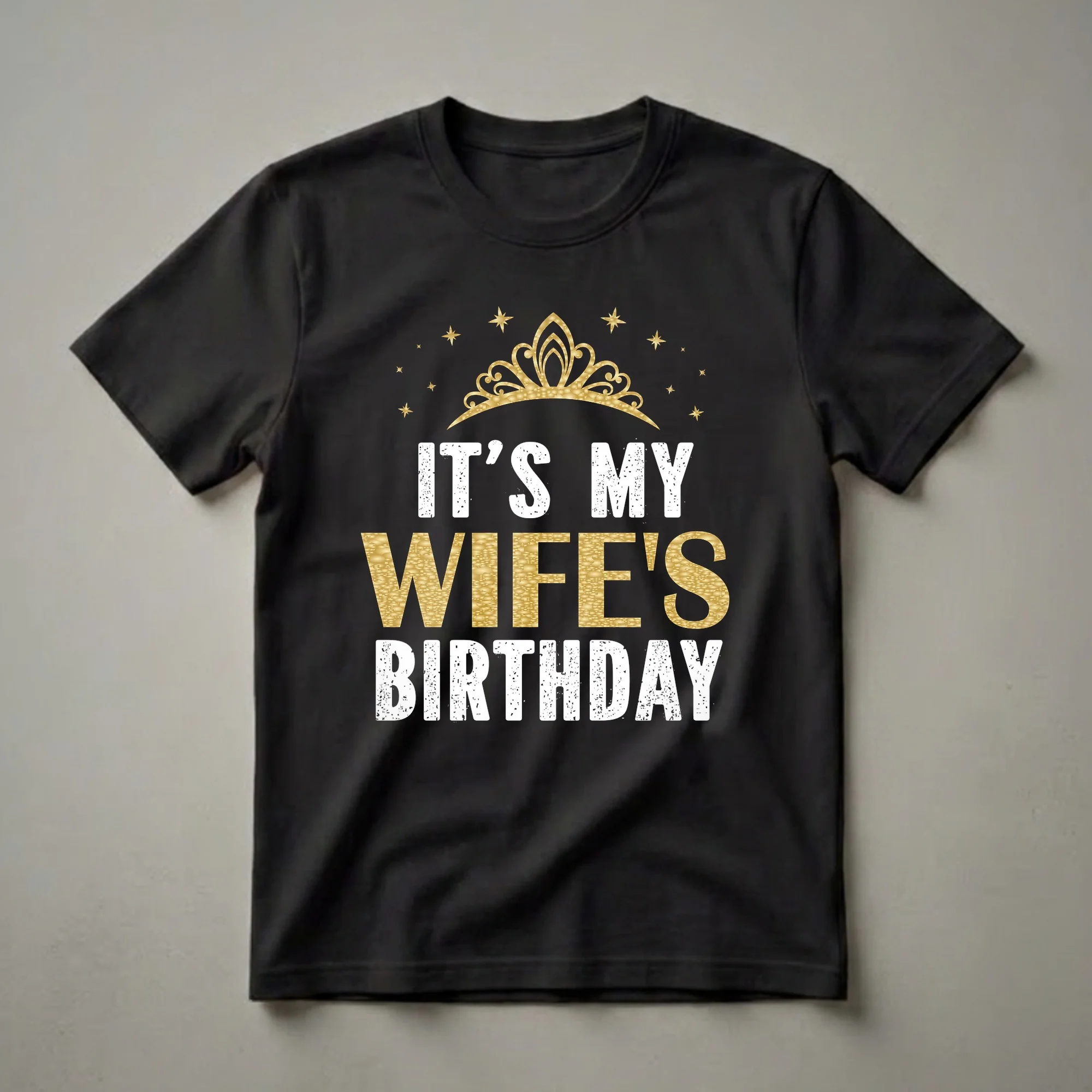 Husbands looking to celebrate their wives will reach for this eye-catching t-shirt. The design prominently features the phrase "IT'S MY WIFE'S BIRTHDAY" in bold, distressed white lettering for the top and bottom lines, with "WIFE'S" rendered in a shimmering, textured gold. Above the text sits an ornate golden crown, sparkling with a textured effect, and surrounded by scattered golden stars against a black background. This graphic tee is a fun way for a husband to show his wife she's the queen of her birthday celebration. It's a thoughtful gift for any husband wanting to make his wife feel special on her big day, whether it's for a milestone birthday or any other occasion. This shirt is also a thoughtful choice for family matching, allowing the husband to proudly declare whose birthday it is while creating a coordinated look for the family party or gathering. Wear it to the birthday dinner, a surprise party, or any festive event to highlight the guest of honor. This shirt serves as a declaration of love and celebration, making her birthday even more memorable.