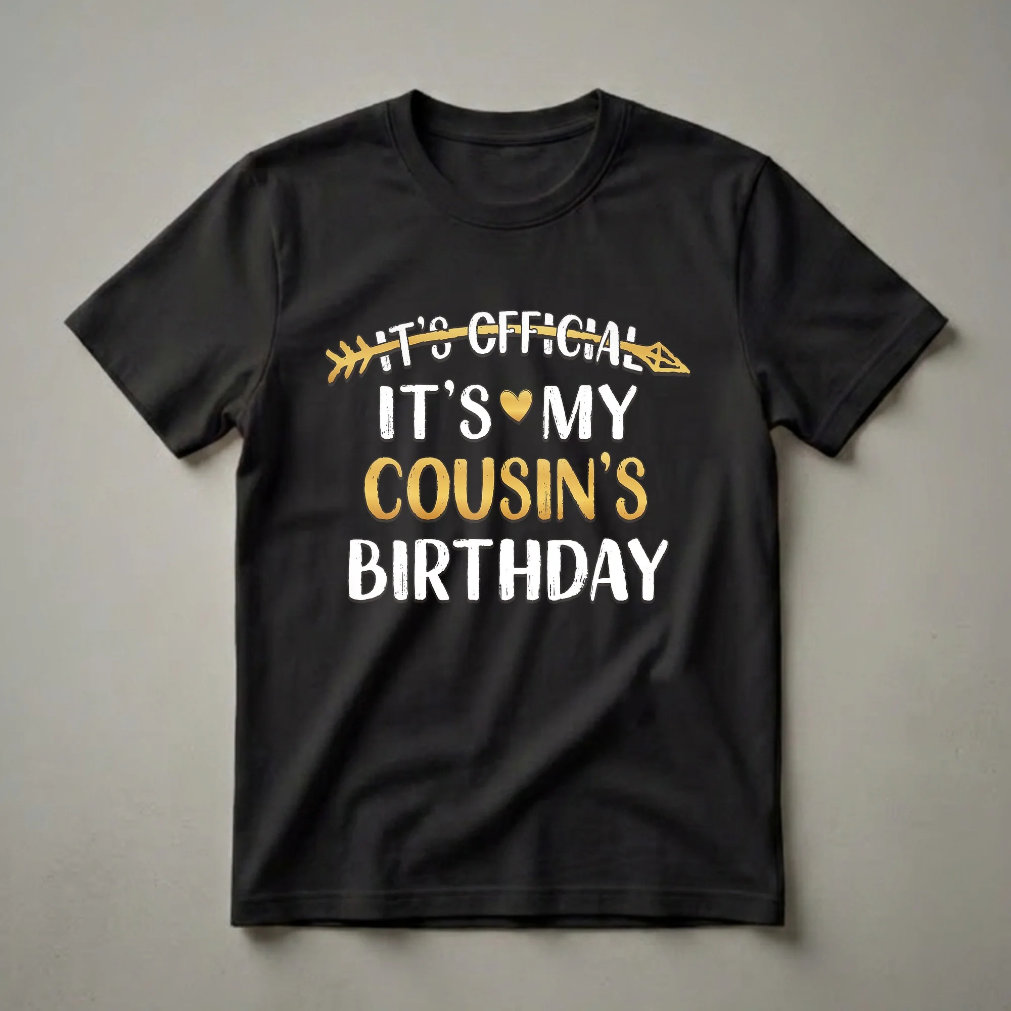 Cousins share a unique bond, often like siblings but with the added freedom of being able to choose how close you want to be. This graphic tee proudly declares 'It's Official It's My Cousin's Birthday,' making it the perfect apparel for anyone celebrating a cousin's special day. The design features bold white lettering for 'IT'S OFFICIAL' and 'BIRTHDAY,' with 'IT'S MY' in white and a golden heart replacing the 'O' in 'MY.' The word 'COUSIN'S' is rendered in a striking metallic gold font, adding a touch of celebration to the statement. This t-shirt is a thoughtful gift for a niece or nephew who wants to show their cousin some birthday love, or for a cousin who enjoys being the center of attention during birthday festivities. Wear this shirt to a family gathering, a birthday party, or any casual outing to spark conversations and share your cousinly pride. It's a fun way to acknowledge a milestone birthday and celebrate the special relationship you share.