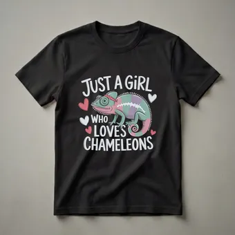 Chameleon lovers, this graphic tee is for you! Featuring a vibrant, cartoon-style chameleon with a playful bandana, this shirt captures the charm of these unique reptiles. The text "JUST A GIRL WHO LOVES CHAMELEONS" is prominently displayed, making a clear statement of affection for these fascinating creatures. Chameleons are renowned for their incredible ability to change color, a remarkable adaptation used for camouflage and communication, and their independently moving eyes that can look in two directions at once. This eye-catching t-shirt is a wonderful way for any girl or woman to express her passion for these captivating lizards. It makes a thoughtful gift for birthdays, holidays, or just because for the chameleon enthusiast in your life. Wear this shirt to the zoo, to a reptile expo, or simply while relaxing at home, showcasing your unique interest in the world of reptiles. This comfortable tee is a staple for any collection celebrating these captivating animals.