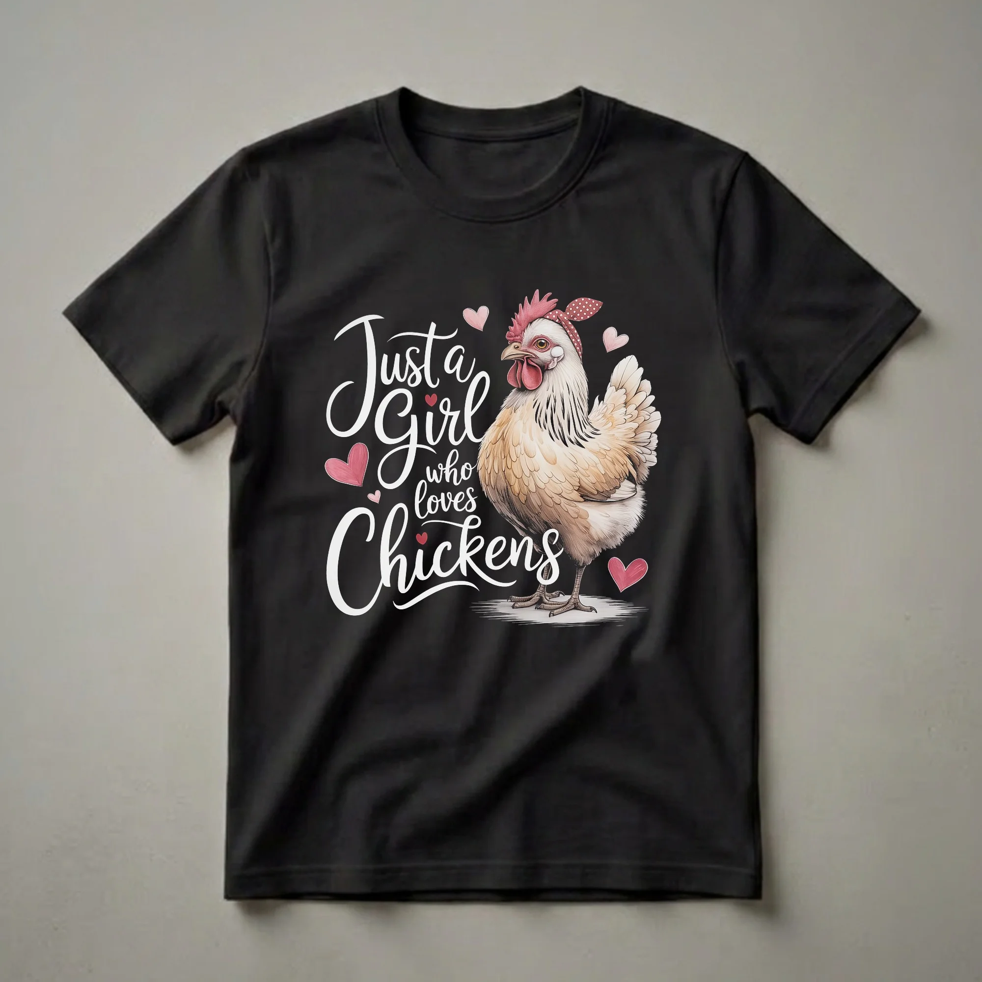 Chicken enthusiasts who adore their feathered friends will reach for this charming graphic tee. The design features a detailed illustration of a white hen wearing a red polka dot bandana, set against a solid black background. Playful white script lettering announces, "Just a Girl who loves Chickens," surrounded by scattered pink and red hearts, adding a touch of whimsy. This shirt is a delightful way for any woman to express her passion for poultry. Chickens, domesticated fowl of the species Gallus gallus domesticus, are known for their varied breeds and their role in providing eggs and meat. This tee works well for women who raise chickens in their backyard or simply admire these fascinating farm animals. It makes a thoughtful gift for birthdays, holidays, or any occasion for the chicken mom in your life. Wear this comfortable t-shirt while visiting a local farm, tending to your flock, or enjoying a casual day out, showcasing your unique love for all things chicken.