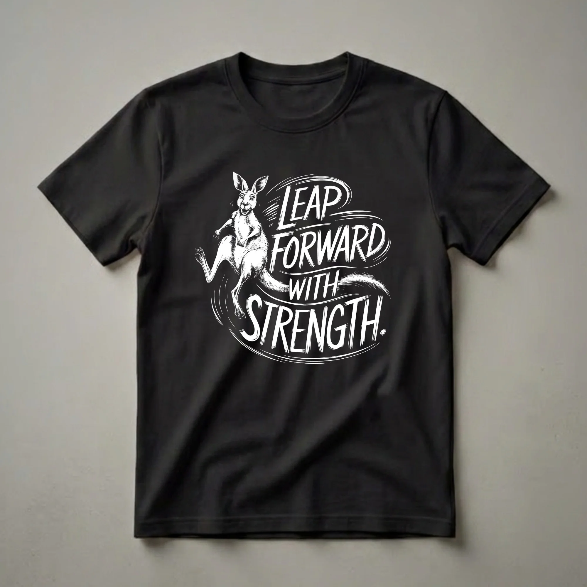 Wildlife enthusiasts will appreciate this eye-catching graphic tee featuring a dynamic kangaroo in mid-leap. The bold white lettering proclaims "LEAP FORWARD WITH STRENGTH," embodying the powerful movement and resilience of these iconic marsupials. Kangaroos, native to Australia, are known for their incredible leaping ability, using their powerful hind legs and tail for balance and propulsion. This shirt is a fantastic way for any nature lover or hiker to express their connection to the wild. It makes a thoughtful gift for someone who draws inspiration from the natural world and embodies a spirit of forward momentum. Wear this t-shirt to your next outdoor adventure or casual outing to showcase your appreciation for these remarkable creatures and their inherent power. This unique design serves as a constant reminder to approach life with vigor and determination, much like a kangaroo bounding across the Australian landscape. This graphic shirt is a staple for anyone who admires the strength and grace of wildlife.