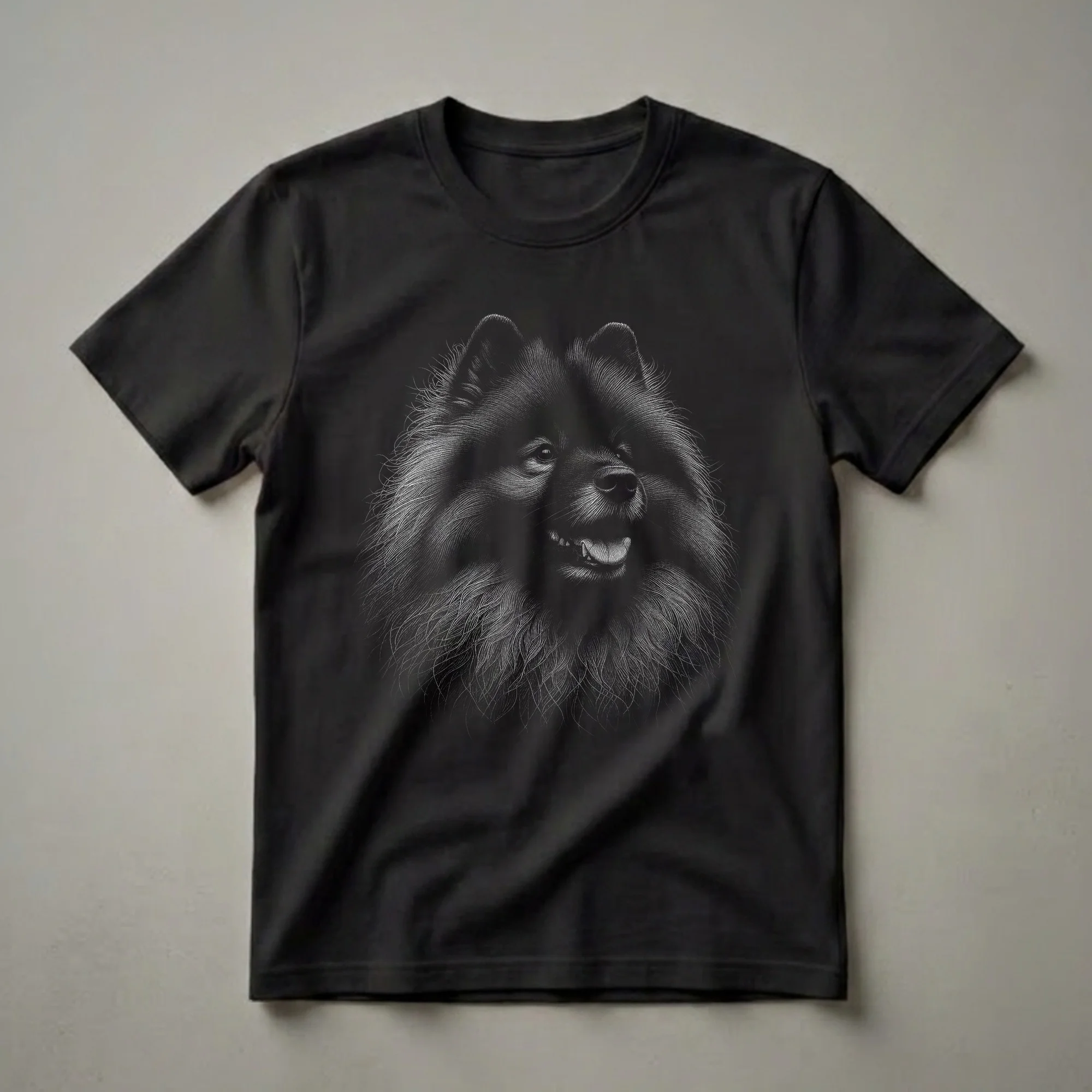 Keeshond owners know the breed's distinctive fluffy coat and alert, friendly expression. This graphic tee captures that spirit with a detailed black and white sketch of a Keeshond's head. The art style uses fine lines to create texture and depth, highlighting the dog's expressive eyes, wet nose, and abundant fur. The Keeshond, originating from Holland, is known for its wolf-like appearance and its role as a companion dog. This shirt is a staple for any dog mom or dad who cherishes their Keeshond. It makes a thoughtful gift for a friend or family member who has a Keeshond. Wear this unique t-shirt to dog parks, casual outings, or simply while relaxing at home with your furry companion. Celebrate your bond with this eye-catching Keeshond apparel.