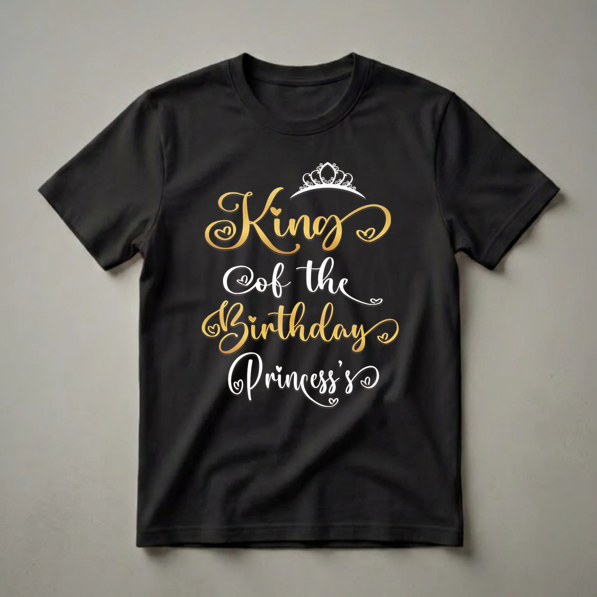 The King of the Birthday Princess's graphic tee is a striking statement piece for any proud father, brother, or uncle celebrating a special girl's birthday. This black t-shirt features elegant script text in gold and white, proclaiming 'King Of The Birthday Princess's' with a regal white crown graphic at the top. This shirt is a thoughtful gift for the man who loves to spoil his little princess, whether it's for her fifth birthday or her fifteenth. Imagine him wearing this at her birthday party, coordinating with matching 'Birthday Princess' shirts for the guest of honor. It’s a fun way to acknowledge his role as the king in her life, making her special day even more memorable. This tee works well for family photos or as a casual outfit for a birthday brunch. It’s a staple in the collection for any dad or brother who cherishes his princess. This shirt is a fantastic way to show family pride and celebrate a milestone birthday together.