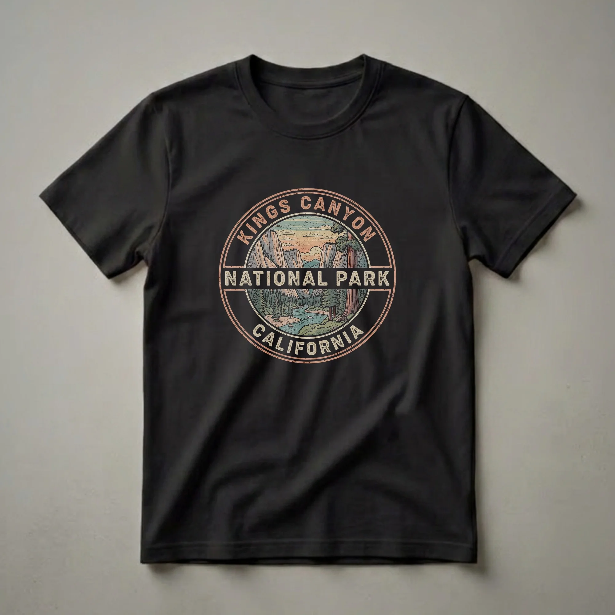 Outdoor enthusiasts and park visitors will reach for this vintage-style Kings Canyon National Park t-shirt. The circular design features a striking depiction of the park's majestic granite cliffs, a winding river, and towering sequoia trees, all set against a sunset sky. Kings Canyon, located in California's Sierra Nevada mountains, is known for its deep canyons and giant trees, second only to Sequoia National Park in size. This graphic tee captures the rugged beauty and serene atmosphere of this iconic national park. It's a staple in the collection for anyone who appreciates the great outdoors and wants to carry a piece of California's wilderness with them. This shirt makes a thoughtful gift for hikers, campers, and anyone who has experienced the awe-inspiring landscapes of Kings Canyon. Wear it on your next adventure or as a reminder of past explorations.