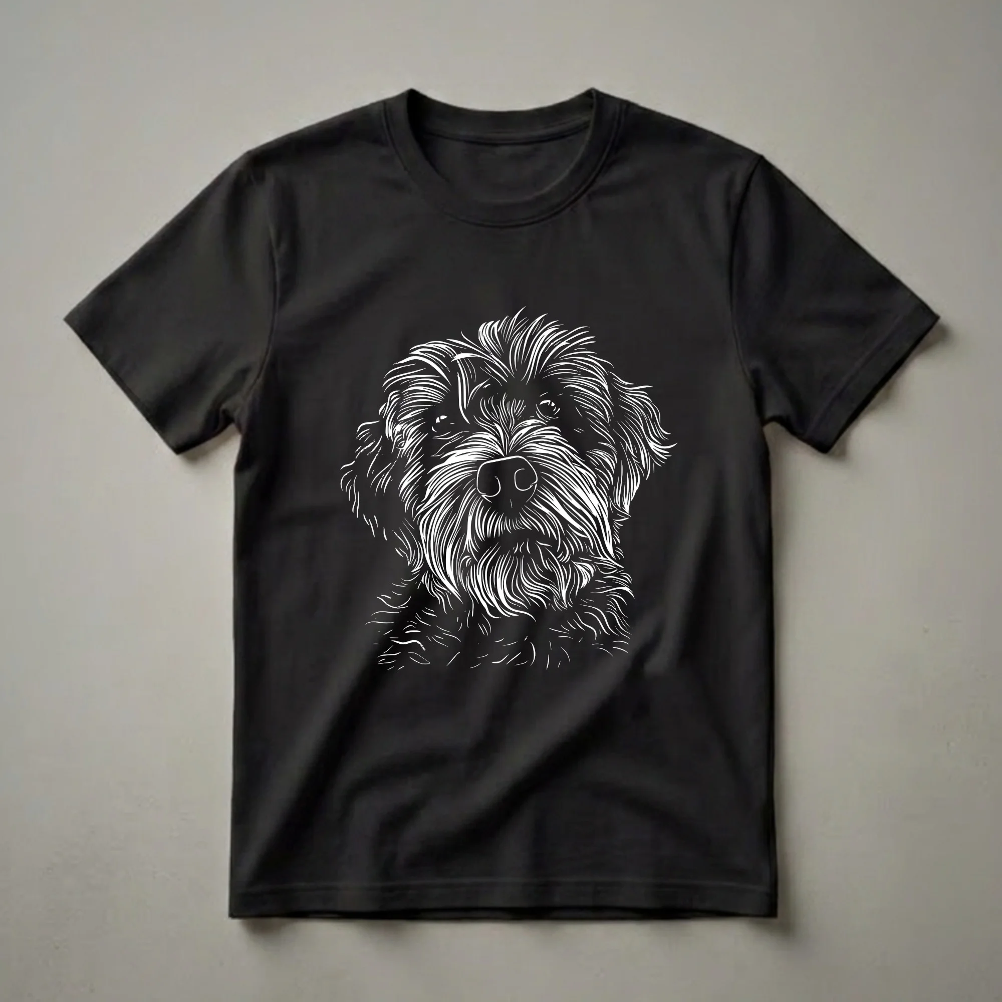 Labradoodle owners know the breed's friendly disposition and curly coats. This graphic t-shirt captures the essence of a Labradoodle with a detailed white line art illustration of its face against a solid black background. The design highlights the dog's expressive eyes, distinctive snout, and fluffy, wavy fur, creating an eye-catching visual. Labradoodles, a cross between a Labrador Retriever and a Poodle, are known for their intelligence and playful nature, often making them wonderful family pets. This tee is a staple for anyone who cherishes their furry companion. It makes a thoughtful gift for the Labradoodle mom or dad in your life who wants to wear their affection for their dog. Wear this shirt to your next dog park visit or casual outing to spark conversations with fellow dog enthusiasts.