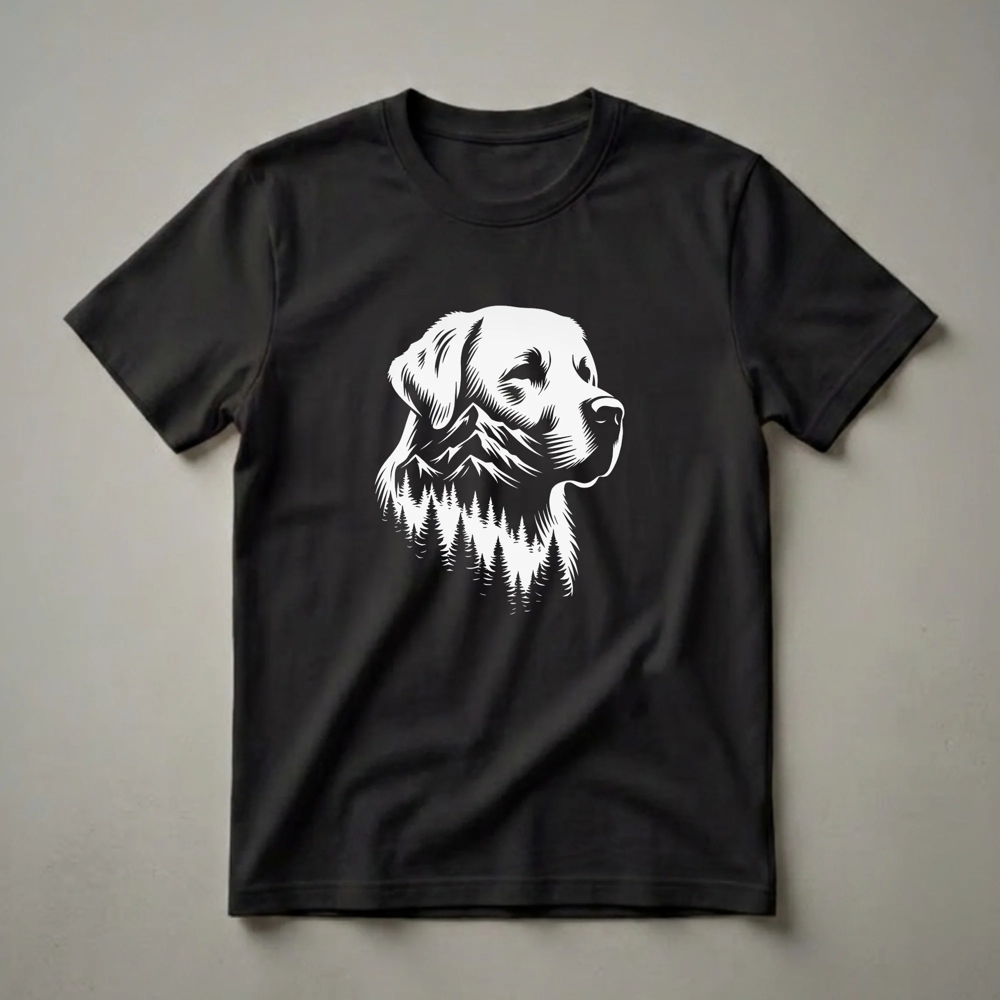 Labrador Retriever owners know the breed's friendly disposition and love for adventure. This eye-catching graphic tee features the iconic profile of a Lab, seamlessly integrated with a majestic mountain range and a dense forest of pine trees. It's a visual representation of the bond between a dog and the natural world. Labrador Retrievers, originally from Newfoundland, are renowned for their retrieving abilities and amiable nature, making them one of the most popular dog breeds worldwide. This unique t-shirt is a staple for any dog enthusiast who appreciates the outdoors. It makes a thoughtful gift for the Labrador mom or dad in your life who enjoys hiking, camping, or simply spending time in nature with their furry companion. Wear this shirt on your next outdoor excursion or casual outing to express your passion for dogs and the wilderness. This graphic shirt is a conversation starter for fellow dog lovers.