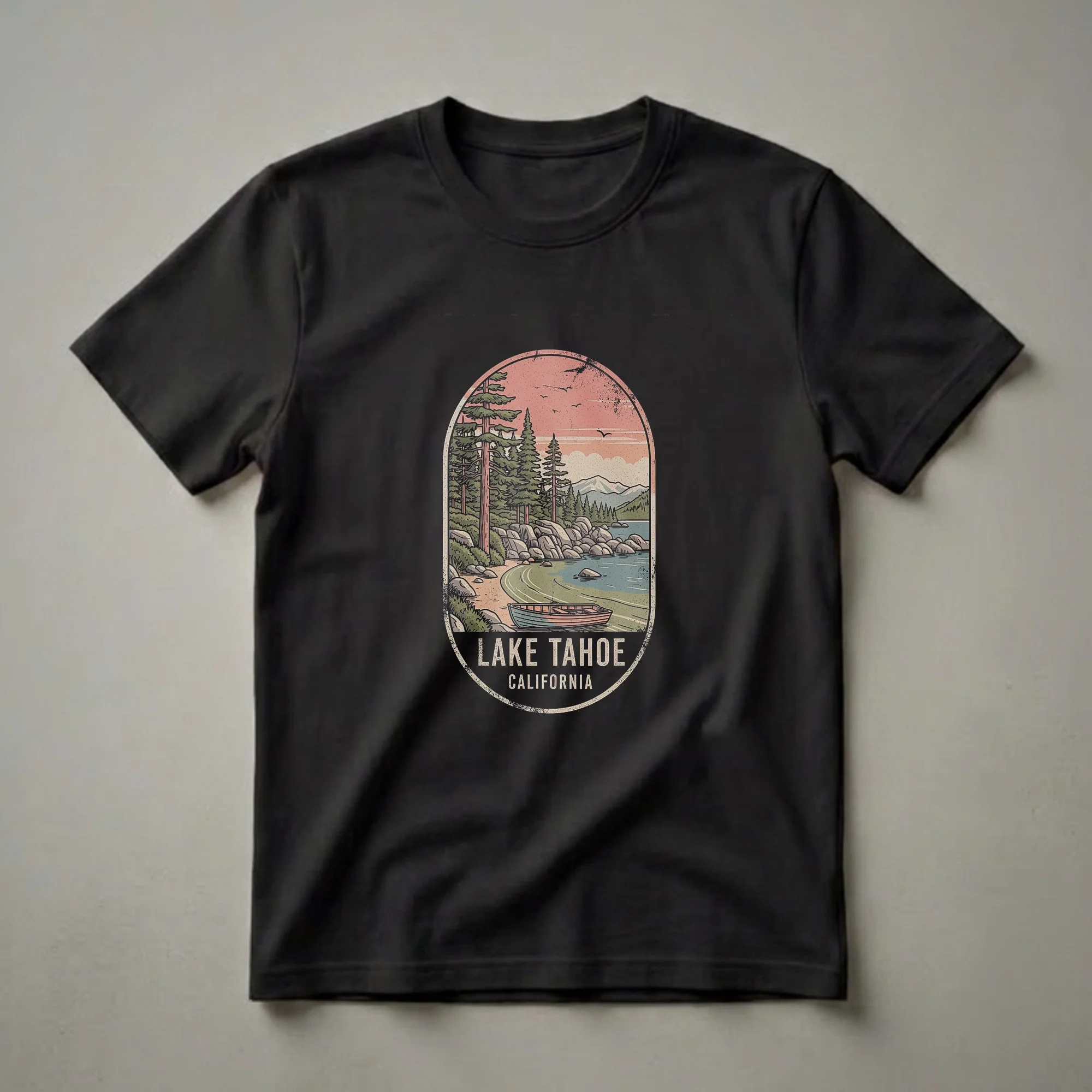 Lake Tahoe, a jewel of the Sierra Nevada mountains straddling the California and Nevada border, is renowned for its stunning alpine scenery and crystal-clear waters. This graphic tee captures that iconic vista, featuring a vintage-style illustration within an oval badge. The artwork showcases a tranquil scene with tall pine trees lining a rocky shore, a classic rowboat resting on the sandy beach, and majestic snow-capped mountains in the distance under a warm, textured sunset sky. Birds soar overhead, adding to the serene atmosphere. This shirt is for anyone who holds a special connection to Lake Tahoe, whether they are a resident, a frequent visitor, or simply an admirer of its natural splendor. It makes a thoughtful gift for travelers, outdoor enthusiasts, or anyone who appreciates retro-inspired nature art. Wear this t-shirt to evoke memories of lakeside adventures, hiking trips in the surrounding forests, or simply to showcase your love for this breathtaking California destination. It's a go-to tee for your casual wardrobe, a thoughtful choice for a day out exploring or relaxing by the water.
