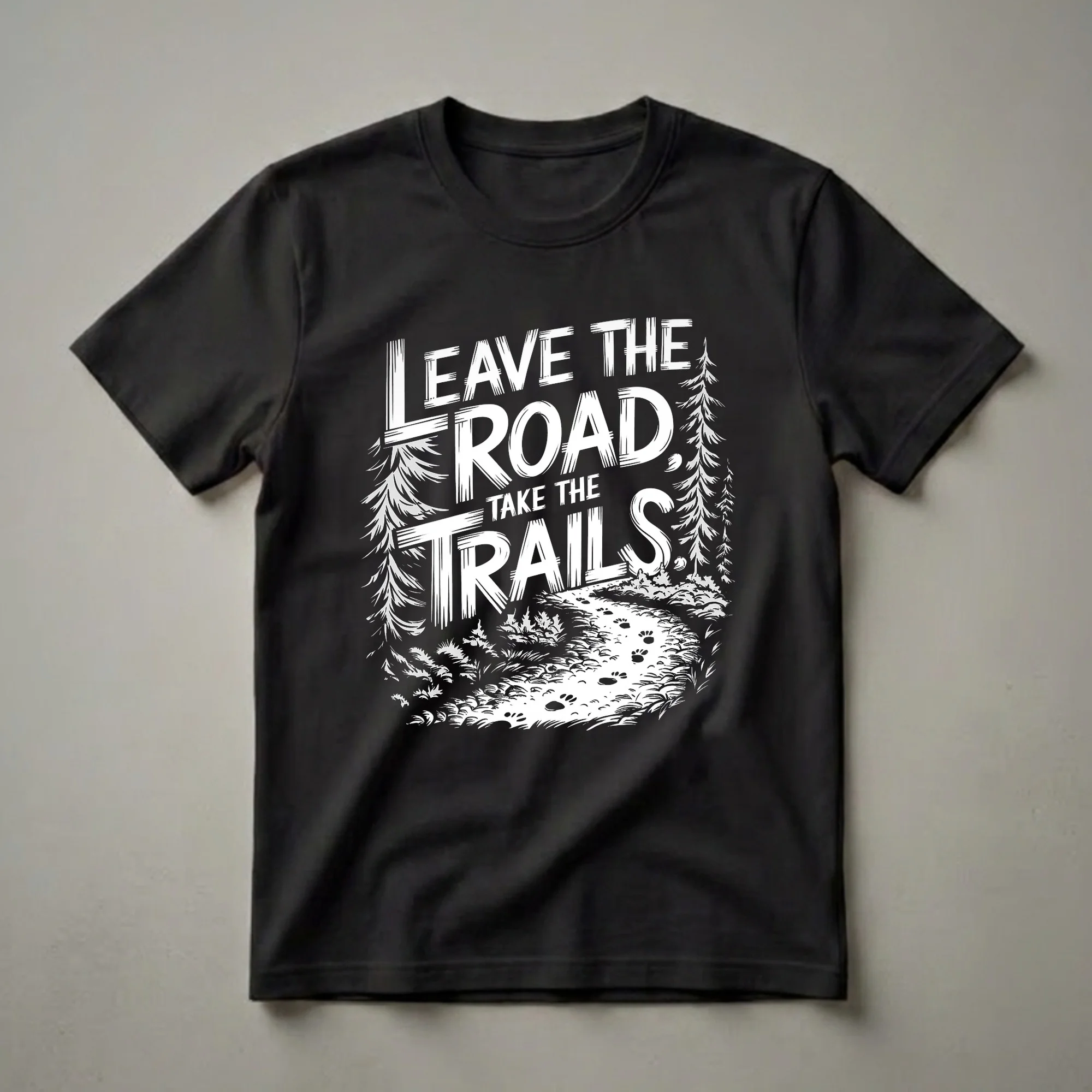 - "Leave the Road, Take the Trails" graphic t-shirt for outdoor enthusiasts.