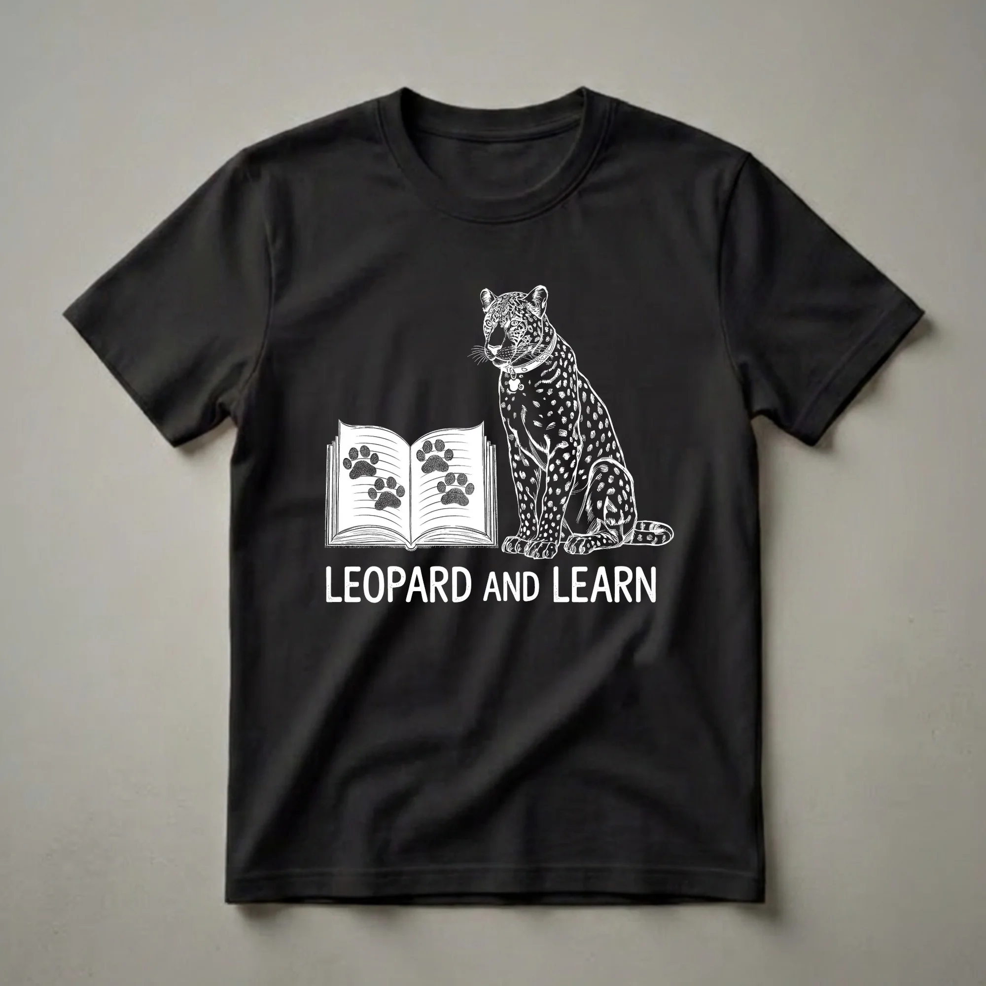 Book lovers who also have a soft spot for big cats will appreciate this striking graphic tee. The design features a detailed white line drawing of a leopard, complete with a collar and tag, seated regally beside an open book. The pages of the book are illustrated with numerous paw prints, playfully suggesting the connection between learning and the animal kingdom. Bold white lettering across the bottom reads "LEOPARD AND LEARN," reinforcing the clever wordplay. Leopards, known for their stealth and intelligence, inhabit diverse environments across Africa and Asia, often found in rainforests, grasslands, and mountainous regions. This shirt is a thoughtful gift for any cat mom or dad who enjoys curling up with a good book. It's a go-to tee for casual outings, library visits, or cozy reading sessions at home. The unique design makes it a conversation starter for anyone who loves both literature and the captivating nature of big cats. This t-shirt celebrates the joy of knowledge and the allure of these magnificent creatures.