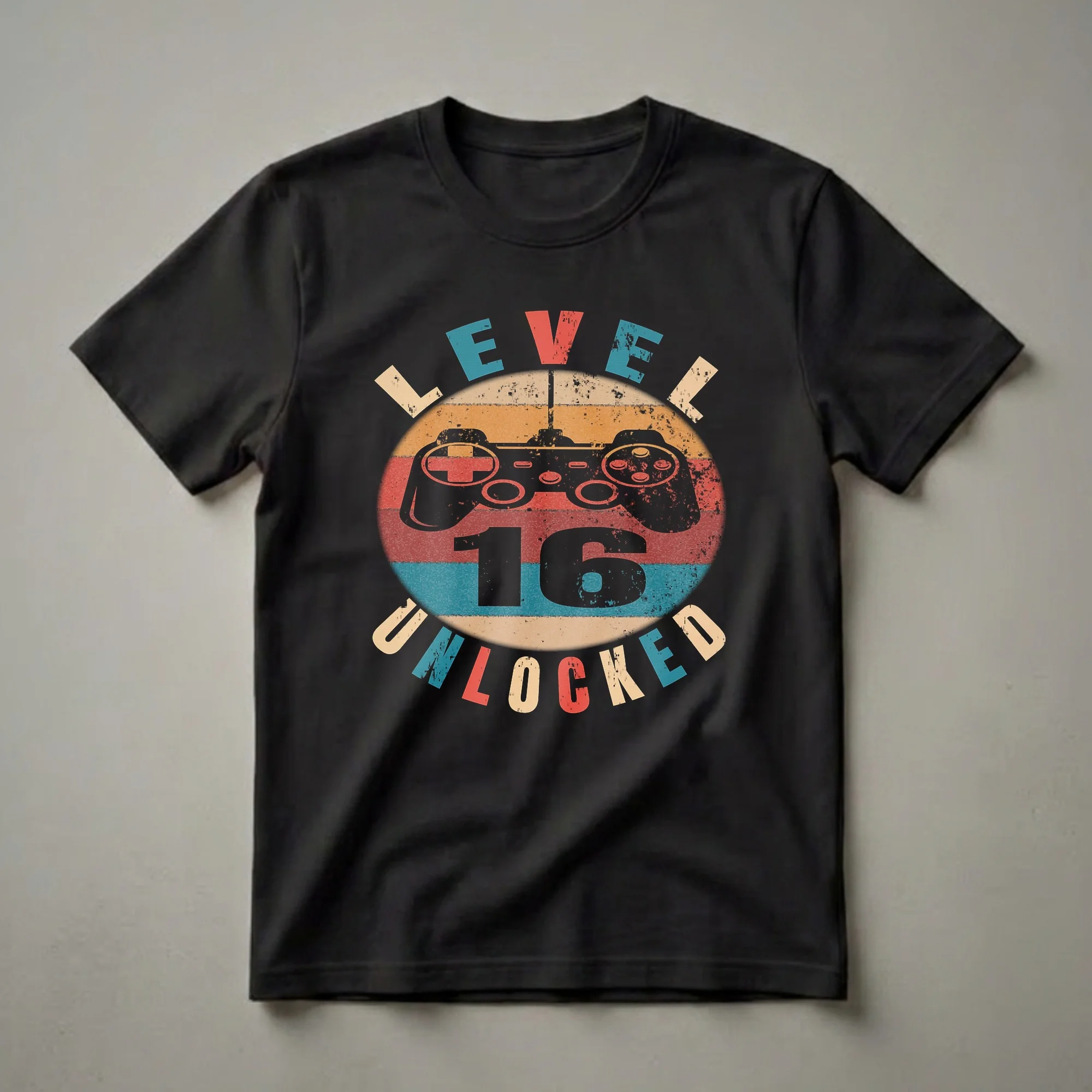 - Celebrate turning sixteen with this 'Level 16 Unlocked' tee featuring a retro game controller.