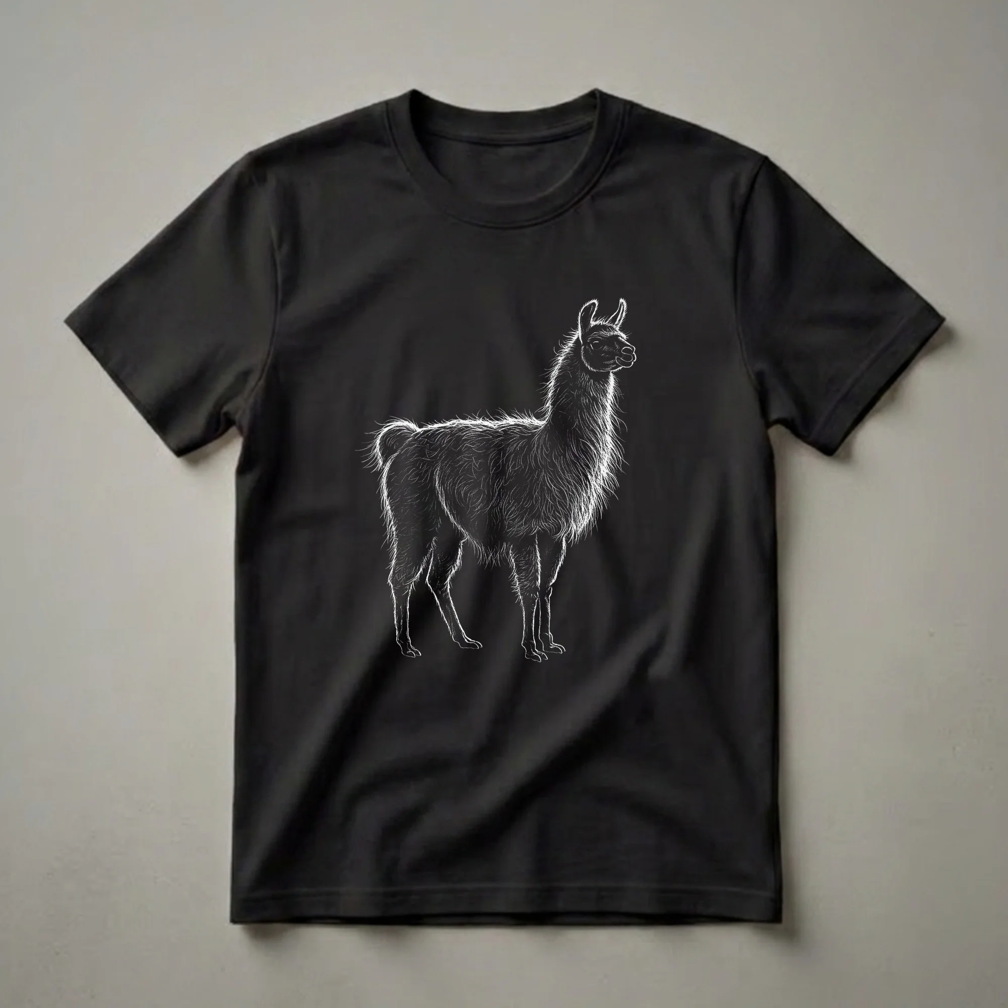 Llama and alpaca enthusiasts will appreciate this eye-catching graphic tee featuring a detailed white line drawing of a llama against a solid black background. The artwork captures the animal's shaggy coat and distinctive facial features with delicate linework, highlighting its gentle nature. Llamas, native to the Andes Mountains of South America, are domesticated South American camelids known for their use as pack animals and for their wool. Alpacas, closely related, are primarily raised for their fiber. This shirt is a thoughtful gift for anyone who admires these fascinating creatures or enjoys unique wildlife art. It's a staple in the collection for hikers, nature lovers, or those who simply appreciate the charm of these South American camelids. Wear this t-shirt on your next nature walk or casual outing to express your passion for wildlife.