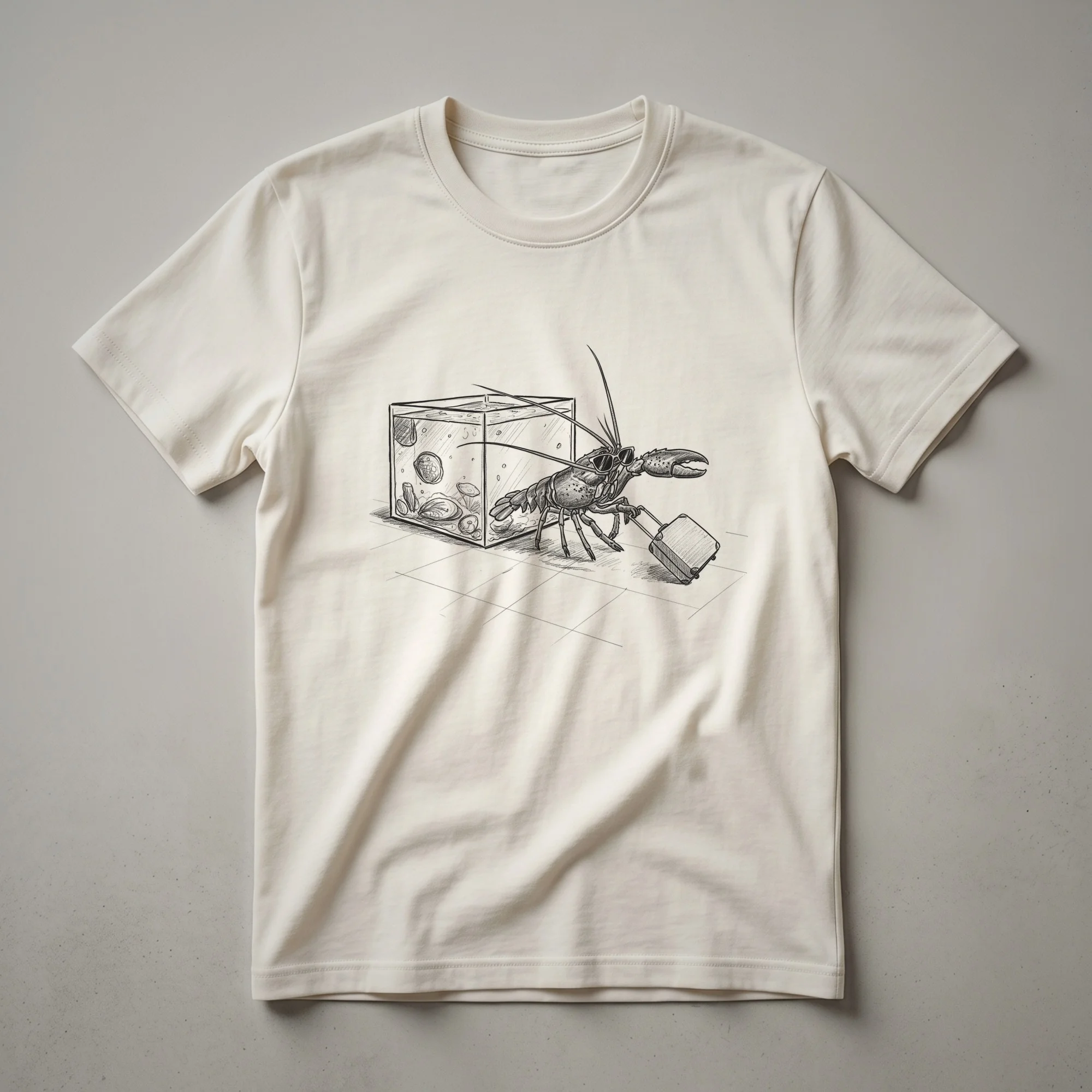 Marine life enthusiasts and seafood aficionados will appreciate this distinctive t-shirt featuring a vintage-style line drawing of a lobster making a daring escape from a seafood tank. The detailed artwork captures the crustacean's determined movement, rendered in a classic black and white aesthetic that evokes a sense of retro charm. Lobsters, known for their powerful claws and bottom-dwelling habits, are fascinating creatures found in oceans worldwide, often featured in culinary traditions. This graphic tee is a thoughtful gift for anyone who admires ocean creatures or enjoys unique, artistic apparel. It's a conversation starter, a thoughtful choice for casual outings, visits to aquariums, or simply relaxing at home. Wear this shirt to express your connection to the sea and its inhabitants, making it a staple in your collection.