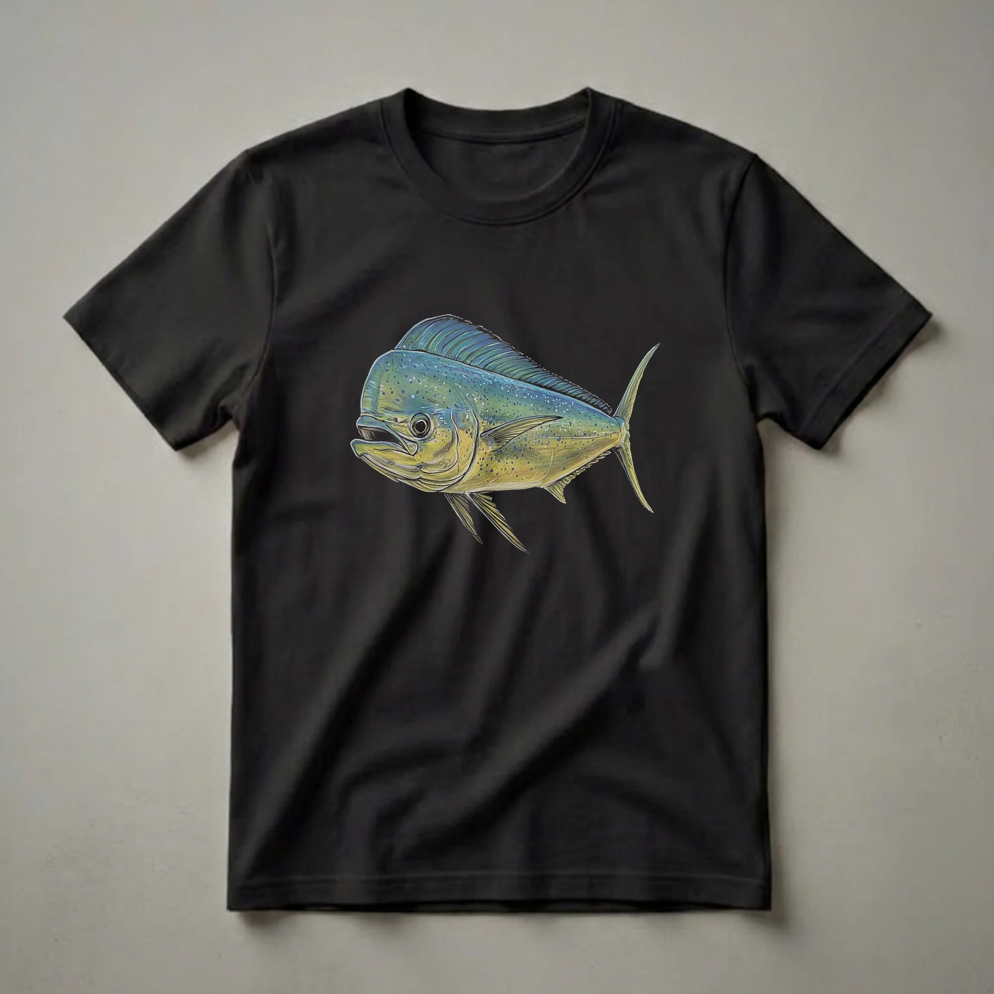 Anglers and ocean wildlife enthusiasts will appreciate the intricate detail of this mahi-mahi drawing, presented as a striking graphic on this comfortable tee. The artwork captures the vibrant colors and distinctive shape of the dolphin fish, known for its iridescent blues and greens, speckled with yellow and blue spots. Mahi-mahi, also known as dolphinfish, are fast-swimming pelagic fish found in tropical and subtropical waters worldwide. They are a popular target for sport fishermen due to their acrobatic fights and delicious flesh. This shirt features a realistic, vintage-style illustration that highlights the fish's powerful build and prominent dorsal fin. It's a fantastic way for fishermen to display their love for the sport and the magnificent creatures they pursue. This t-shirt works well for casual wear, fishing trips, or as a thoughtful gift for the fisherman in your life who dreams of their next big catch. Wear it to the marina or while recounting tales of the one that got away.