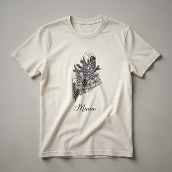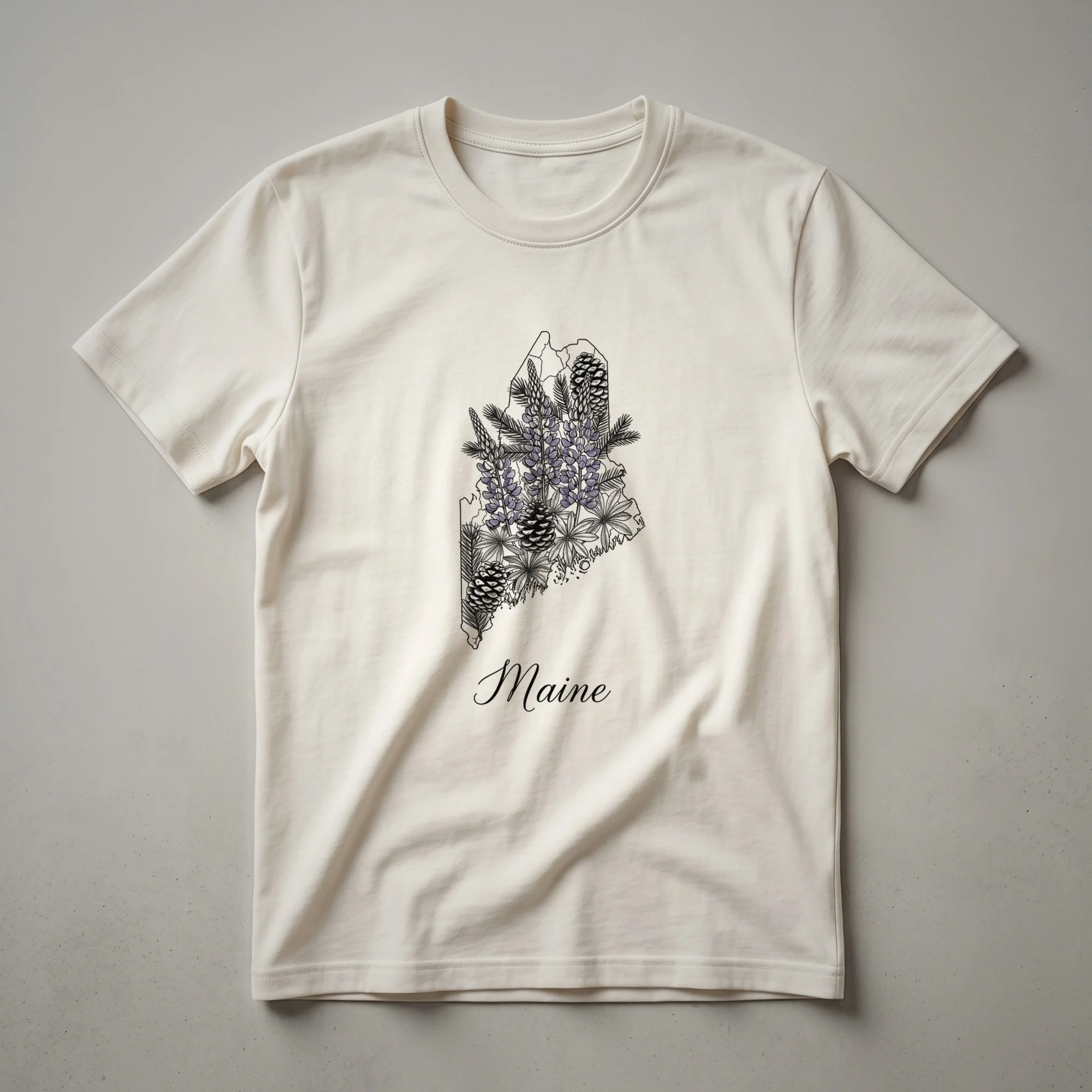Maine's rugged coastline and lush forests are captured in this artistic graphic tee. The outline of the state is intricately detailed with a sketch of lupine flowers, a state symbol, alongside pine needles and pinecones, evoking the natural beauty of the Pine Tree State. Maine, known for its picturesque lighthouses and abundant blueberry fields, offers a unique charm that this shirt celebrates. This apparel is a wonderful way for residents and visitors alike to express their connection to Maine. Whether you're a proud Mainer or have fond memories of visiting, this t-shirt serves as a wearable reminder of the state's natural splendor. It makes a thoughtful gift for anyone who cherishes Maine's scenic landscapes and outdoor adventures. Wear this tee to casual outings, while exploring the coast, or simply to showcase your state pride. This design is a go-to tee for anyone wanting to carry a piece of Maine with them.