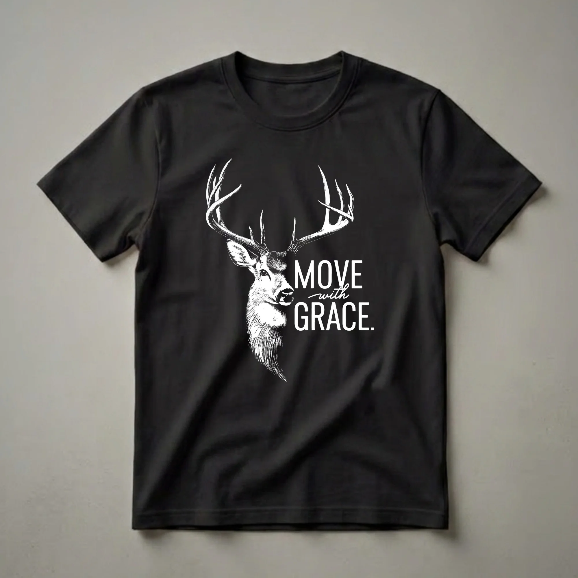 Wildlife enthusiasts and nature lovers will appreciate this striking graphic tee featuring a majestic deer. The design showcases the head of a buck with impressive antlers, rendered in a bold black and white sketch style. The phrase 'MOVE with GRACE.' is prominently displayed alongside the deer, embodying the animal's natural elegance and quiet power. Deer, such as the white-tailed deer common in North American forests, are known for their agility and ability to navigate dense woodlands with remarkable stealth. This shirt is a thoughtful gift for anyone who finds peace and inspiration in the natural world, whether they are hikers, campers, or simply appreciate the serene beauty of the wilderness. Wear this t-shirt on your next outdoor adventure or casual outing to express your connection to the wild. It's a staple in the collection for those who admire the grace and resilience of forest creatures. This apparel serves as a constant reminder to approach life with the same quiet dignity and poise as the deer.