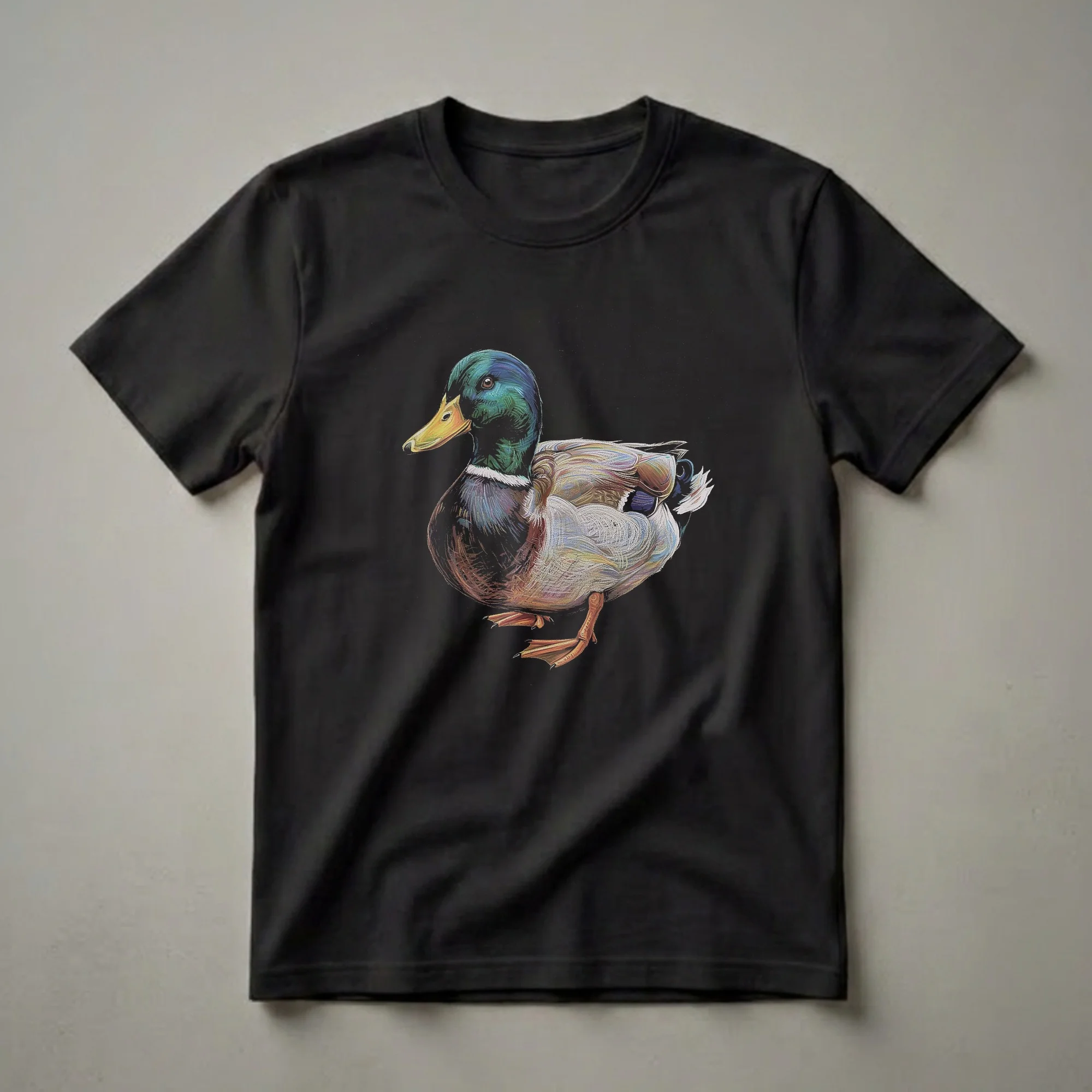 Bird watchers and nature enthusiasts will appreciate the detailed artistry of this Mallard Duck drawing t-shirt. The design features a male mallard duck, showcasing its iconic iridescent green head, bright yellow bill, and intricately rendered body feathers in shades of brown, white, and blue. This striking graphic tee captures the essence of the mallard, a common yet beautiful dabbling duck found across North America, Europe, and Asia. Mallards are known for their adaptability, thriving in diverse wetland habitats from marshes and ponds to rivers and even urban parks. This shirt is a thoughtful gift for anyone who enjoys observing wildlife, hiking near waterways, or simply admires the natural beauty of these common waterfowl. It's a go-to tee for casual outings, nature walks, or simply relaxing at home while celebrating your passion for avian life. Wear this unique piece of apparel to express your connection to the natural world and the fascinating creatures that inhabit it.