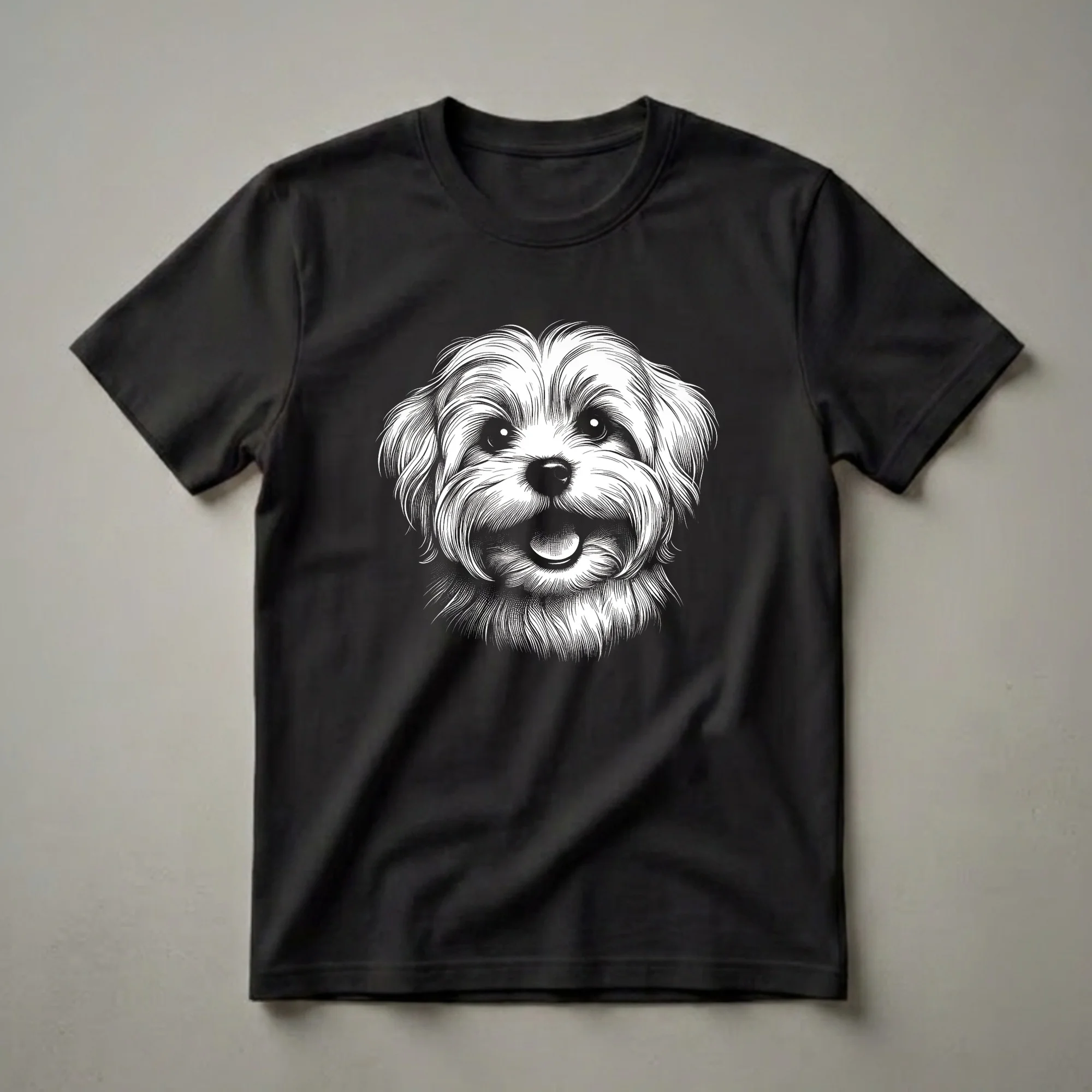 Maltese dog owners who appreciate the breed's charming personality and elegant appearance will reach for this unique graphic tee. The design features a detailed, black and white line art illustration of a Maltese dog's face, capturing its characteristic fluffy fur and expressive eyes. This artistic representation highlights the breed's gentle nature and playful spirit, making it a standout piece for any dog lover's wardrobe. Maltese dogs, originating from the Mediterranean island of Malta, are known for their affectionate and lively demeanor, often serving as devoted companions. This t-shirt works well for casual outings, dog park visits, or simply relaxing at home. It makes a thoughtful gift for anyone who cherishes their Maltese companion or admires the breed. This shirt is a staple for those who want to wear their canine affection with style and artistic flair. The intricate linework creates an eye-catching visual that dog enthusiasts will admire. This apparel is a wonderful way to express your passion for these delightful dogs.