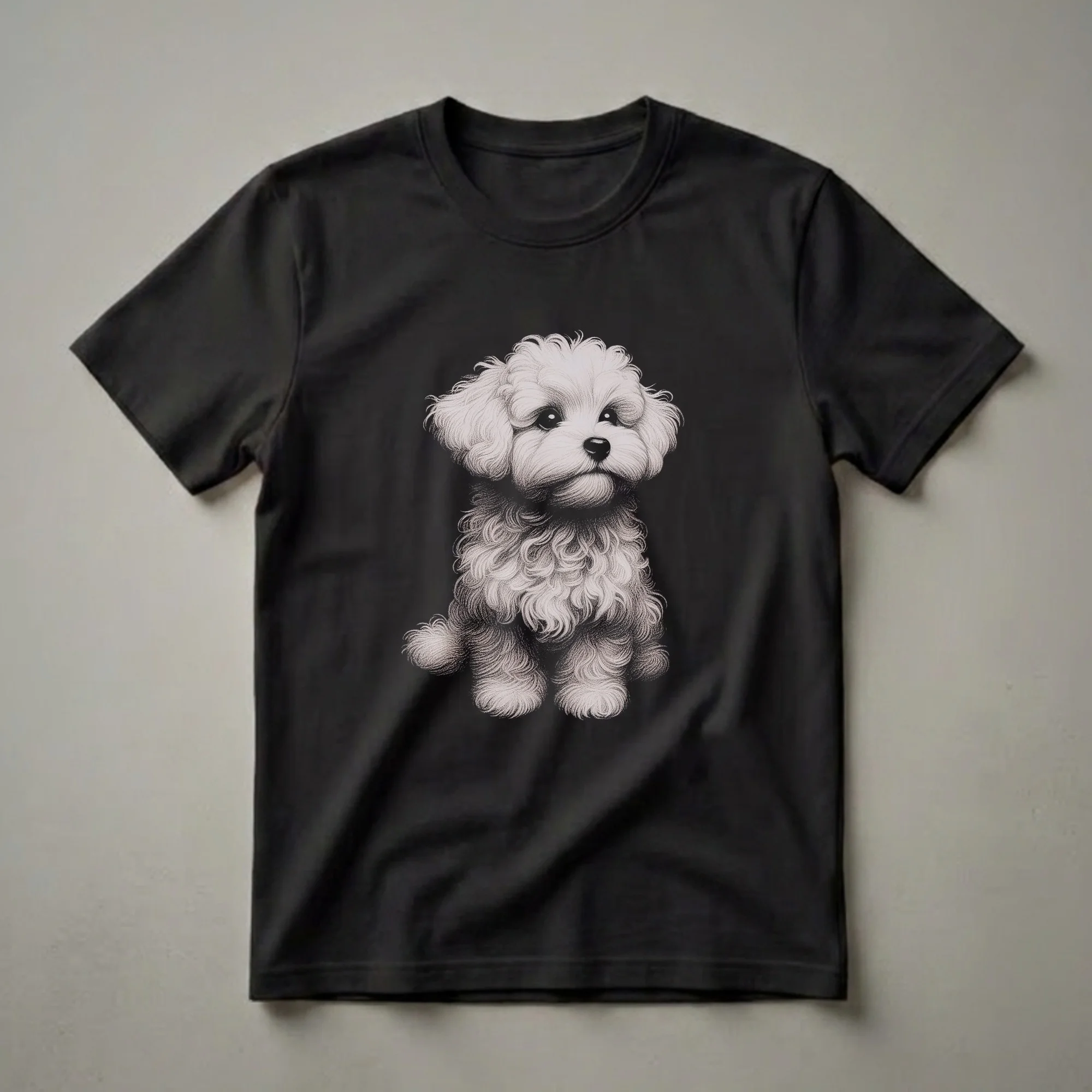 Maltipoo owners know the joy these small, fluffy dogs bring into a home. This graphic tee features a detailed pencil-style drawing of a Maltipoo puppy, capturing its endearing features and curly coat. The artwork is rendered with fine lines, giving it a classic, artistic feel against a stark black background. Maltipoos, a cross between a Maltese and a Poodle, are known for their playful and affectionate nature, often described as having a 'clownish' personality. This shirt is a wonderful way for Maltipoo moms and dads to express their devotion to their furry companions. It makes a thoughtful gift for anyone who cherishes their Maltipoo, whether for a birthday or just because. Wear this unique t-shirt to the dog park, on casual outings, or while relaxing at home with your beloved pet. It’s a staple in the collection for any dog enthusiast who appreciates artistic representations of their favorite breed. This eye-catching design is sure to spark conversations among fellow dog lovers.