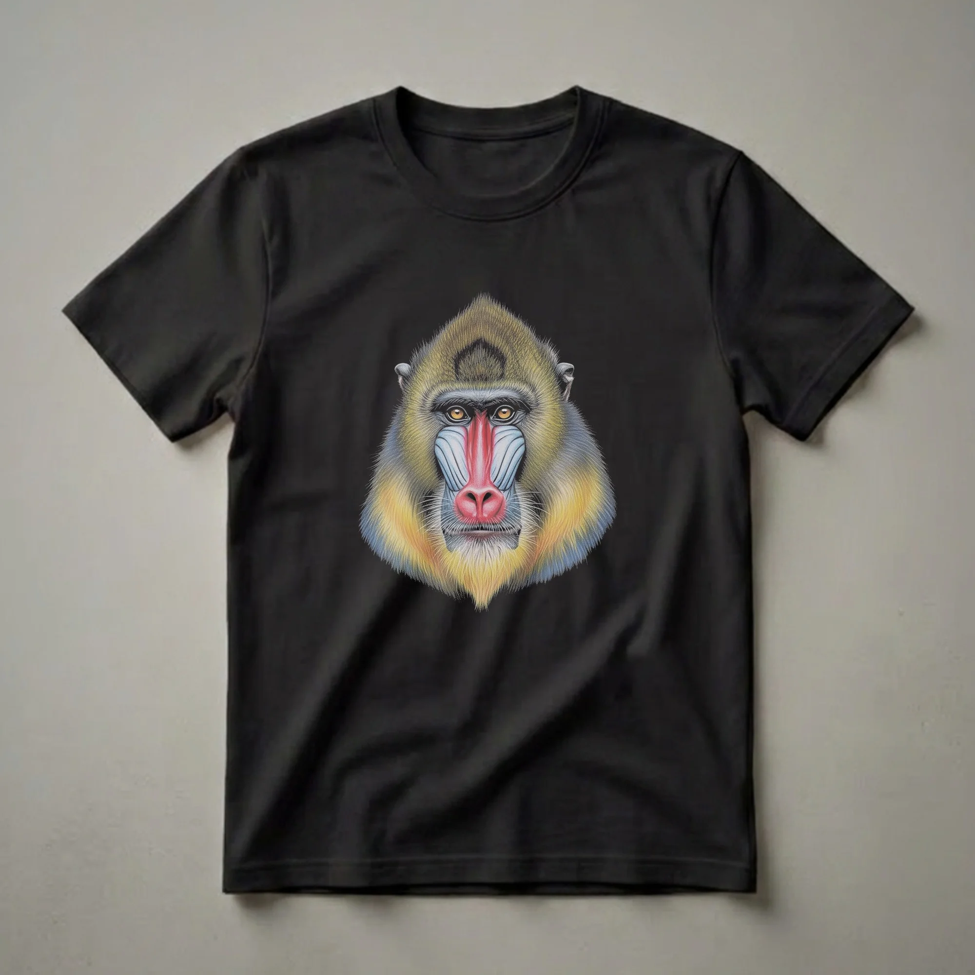 Primate enthusiasts and lovers of detailed wildlife art will appreciate this striking graphic tee featuring a mandrill. The artwork showcases the mandrill's distinctive facial features, rendered with incredible detail using colored pencils. The vibrant blues, reds, and yellows of its face stand out against the dark fur and the black background of the shirt. Mandrills, known for their colorful faces and social structures, are the largest of all monkeys and are native to the rainforests of Central Africa. This shirt is a thoughtful gift for anyone who admires these fascinating primates or appreciates fine art. It's a go-to tee for casual outings, nature walks, or simply expressing a passion for the animal kingdom. Wear this unique t-shirt to spark conversations about wildlife conservation and the beauty of the natural world. This apparel is a staple for those who seek distinctive designs that celebrate the diversity of life on Earth. This shirt is a unique piece of wearable art.