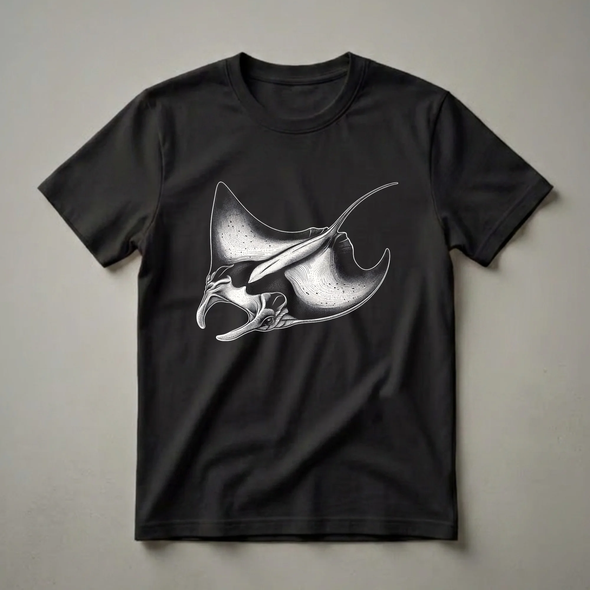 Ocean lovers and marine enthusiasts will appreciate the intricate detail of this manta ray graphic art t-shirt. The design features a striking linocut-style illustration of a manta ray, rendered in high contrast with fine linework and stippling to capture its majestic form. Manta rays, known for their graceful movements through tropical and subtropical waters, are filter feeders that glide through the ocean with their distinctive wing-like pectoral fins. This tee is a thoughtful gift for divers, marine biologists, or anyone captivated by the beauty of the underwater world. It's a go-to tee for casual outings, beach trips, or simply expressing a passion for marine life. Wear this shirt to your next aquarium visit or while exploring coastal areas, and let the intricate artwork speak to your appreciation for these magnificent creatures. The detailed linework makes this shirt a standout piece for any ocean-themed wardrobe, celebrating the gentle giants of the sea.