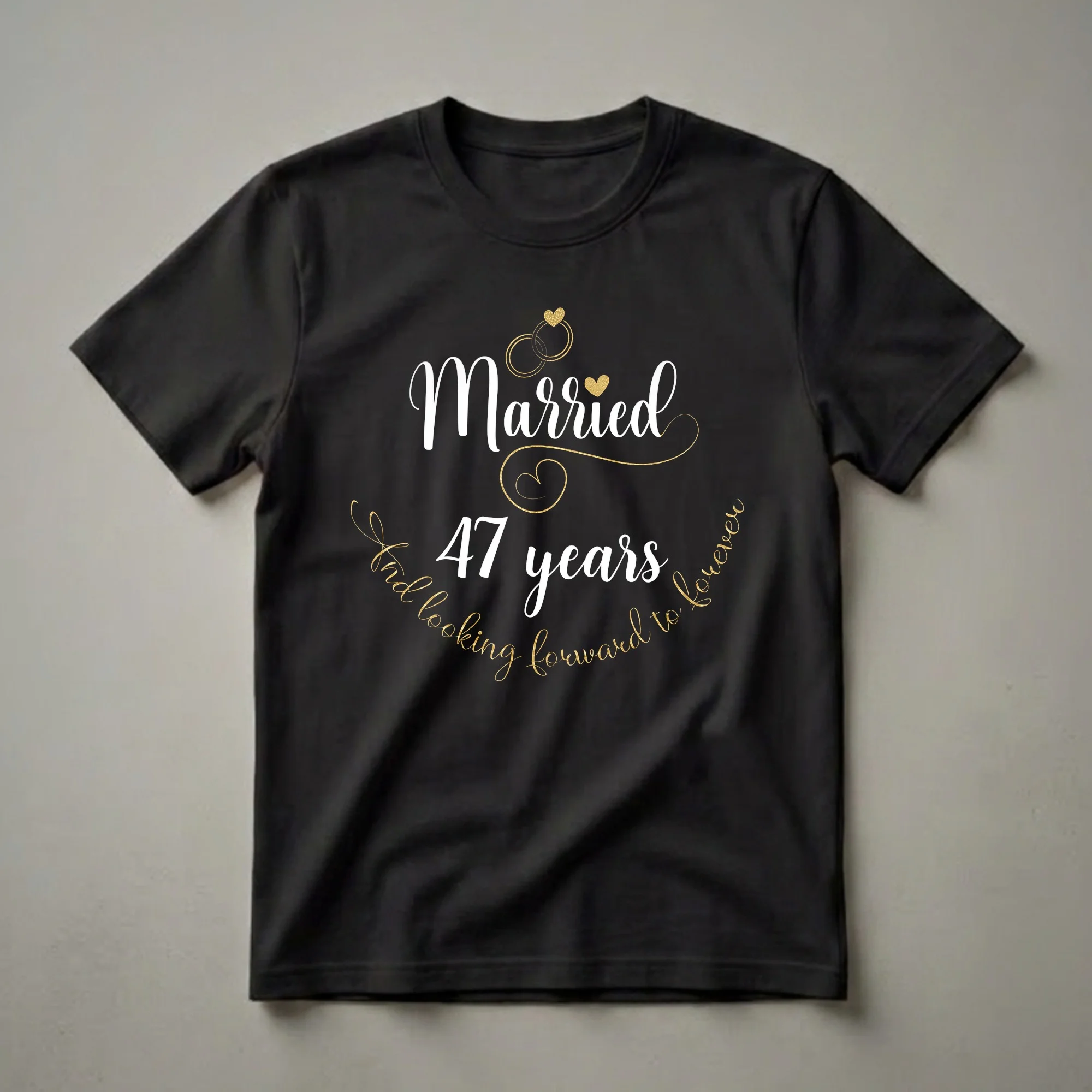 Married couples celebrating their 47th anniversary can proudly display their enduring love with this special t-shirt. The design features elegant white script for "Married" and "47 years," accented by shimmering gold for the number and the phrase "And looking forward to forever." At the top, intertwined gold rings with small gold hearts symbolize the union, while a delicate gold heart embellishes the word "years." This shirt is a wonderful way for a couple to commemorate nearly five decades together, a milestone that speaks to commitment and shared history. The 47th anniversary is traditionally associated with the amethyst gemstone, symbolizing sincerity and wisdom gained through years of partnership. This tee is a thoughtful gift for the couple who has built a life together, offering a sweet reminder of their journey and their continued anticipation of future happiness. Wear this shirt to an anniversary dinner, a family gathering, or simply as a daily expression of your lasting bond.