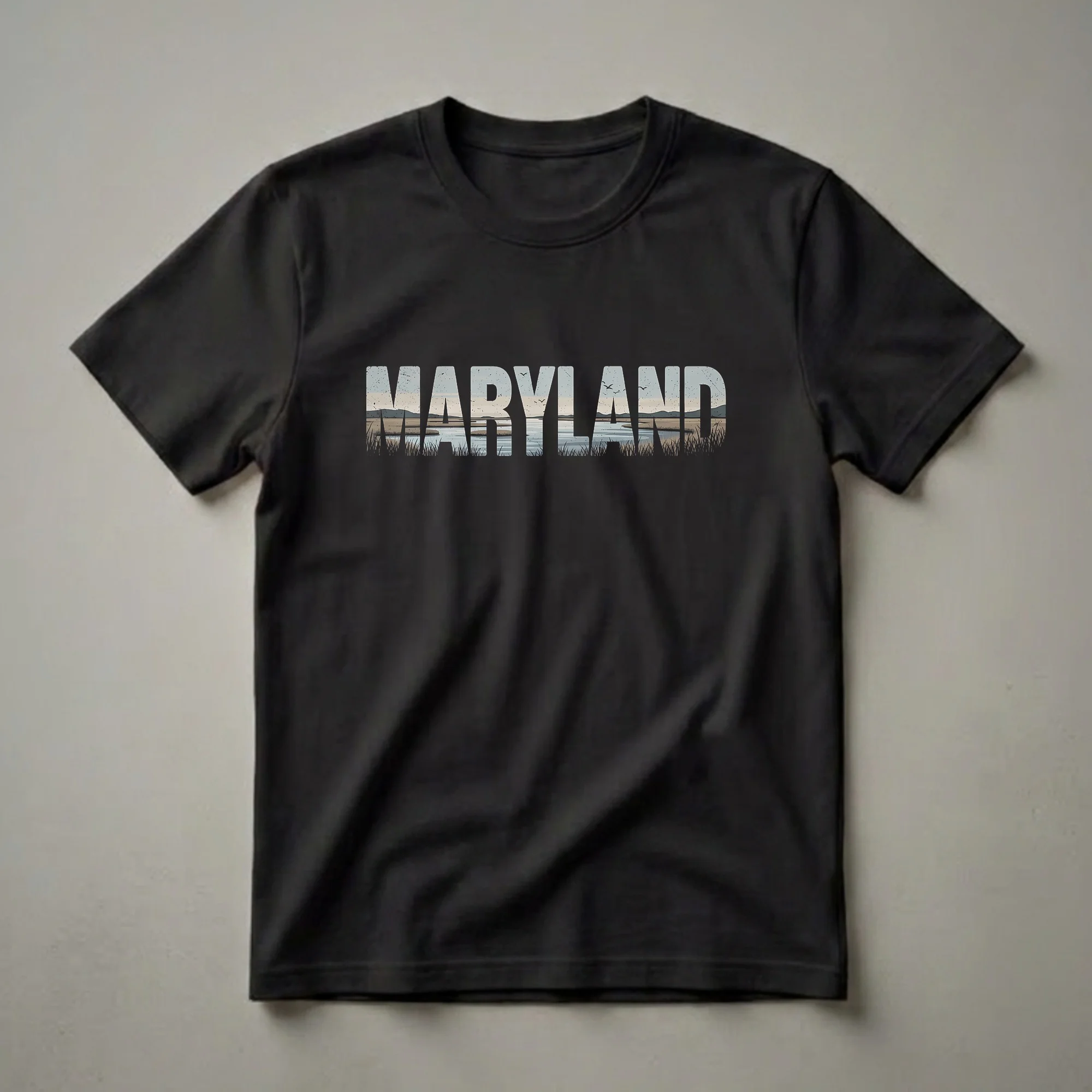 Maryland residents and visitors who appreciate the state's natural beauty will reach for this graphic tee. The design showcases the word "MARYLAND" filled with a scenic vista of a tranquil marsh. Tall grasses in the foreground give way to calm water reflecting a muted sky with distant hills. Several birds are depicted in flight, adding a sense of movement to the serene scene. This shirt celebrates the unique ecosystems found throughout the Old Line State, from the Chesapeake Bay's wetlands to its coastal marshes. Maryland is known for its diverse geography, encompassing mountains, rolling hills, and extensive waterways, making it a haven for wildlife and outdoor enthusiasts. This t-shirt serves as a wearable reminder of the state's natural charm. It makes a thoughtful gift for anyone who calls Maryland home, has fond memories of visiting, or simply admires its picturesque landscapes. Wear this comfortable tee to casual outings, while exploring local parks, or to show your state spirit.
