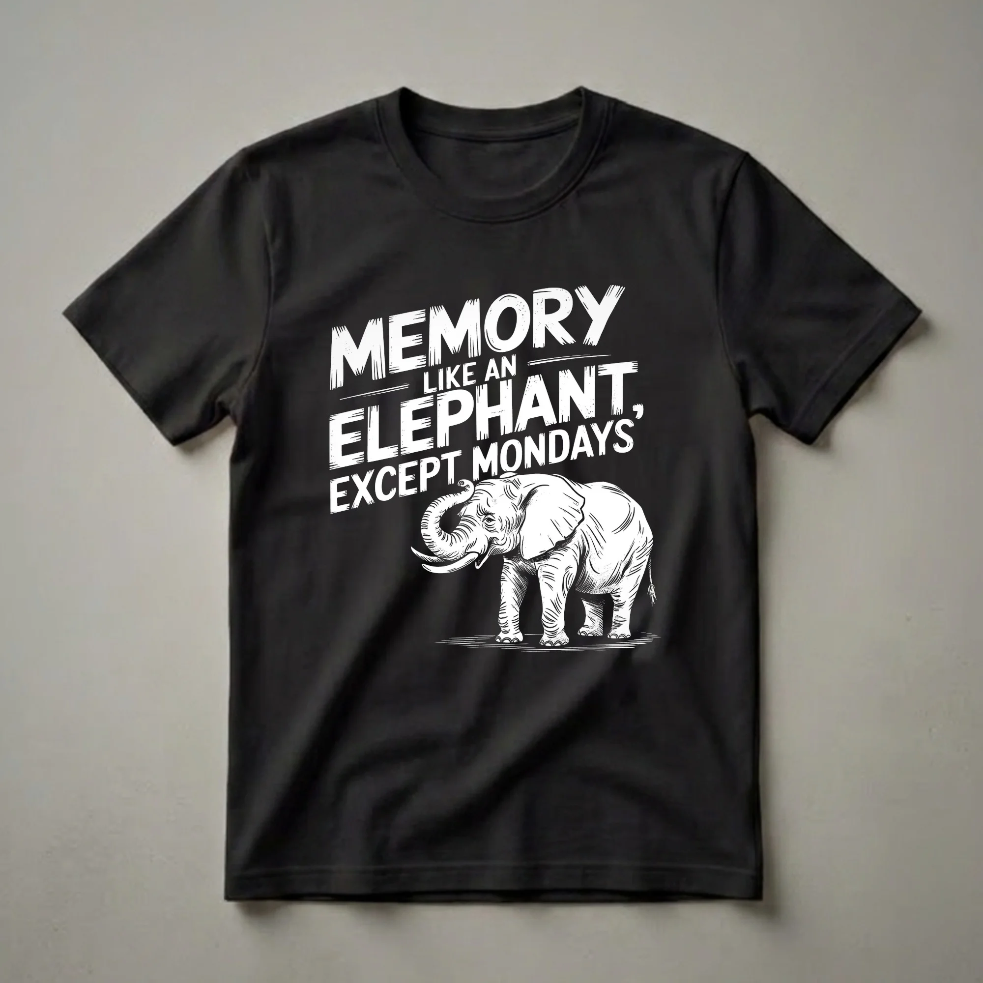 Elephants are renowned for their incredible memory, a trait often associated with their intelligence and social bonds. This striking graphic tee plays on that common knowledge with a humorous twist, a thoughtful choice for anyone who finds Mondays a particular challenge. The design showcases a detailed, black and white illustration of an elephant, rendered in a scratchy, distressed linework style that gives it a vintage feel. Bold, white, distressed lettering across the top reads 'MEMORY LIKE AN ELEPHANT,' with the punchline 'EXCEPT MONDAYS' positioned below. This shirt is a thoughtful gift for friends, family members, or colleagues who appreciate a good laugh and can relate to the weekly struggle of starting the work week. It’s a great conversation starter and a way to express a relatable sentiment with a touch of wit. Wear this tee to casual outings, game nights, or even to the office on a Friday to lighten the mood. It’s a staple in any collection for those who enjoy novelty apparel with a clever message.