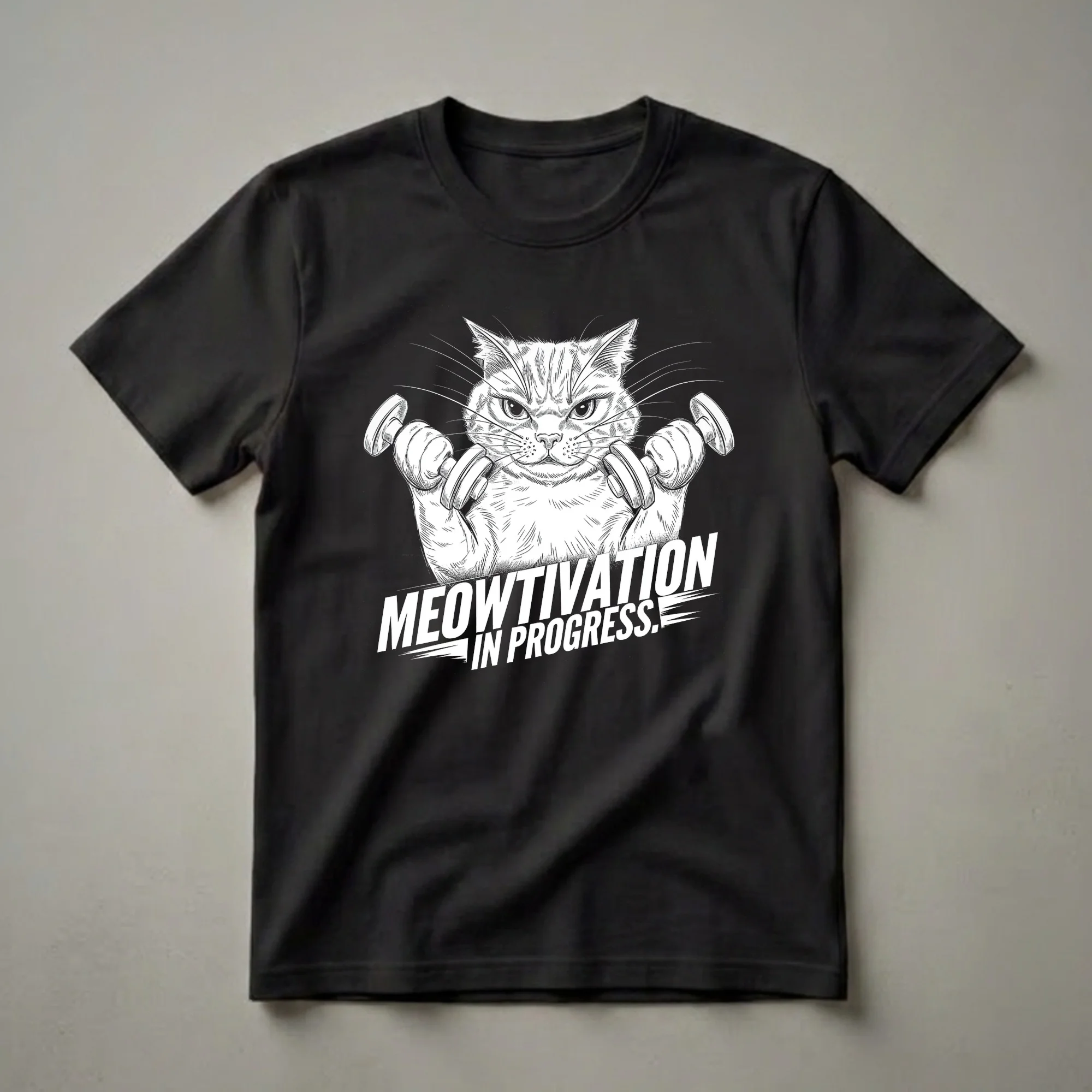 Cat moms and dads who are committed to their fitness journey will appreciate this unique graphic tee. The striking black and white sketch features a determined cat, possibly a British Shorthair with its broad face and dense fur, actively lifting a pair of dumbbells. This visual is paired with the bold text 'Meowtivation in Progress,' a playful nod to the feline's focus and dedication. Cats are known for their agility and surprising strength, often observed leaping and climbing with impressive power. This shirt captures that inherent energy and translates it into a motivational message for anyone hitting the gym or working towards their personal goals. It's a thoughtful gift for the cat lover in your life who also enjoys a good workout, making it a staple in their casual wear collection. Wear this t-shirt to your next gym session or casual outing to showcase your dual passions for felines and fitness.