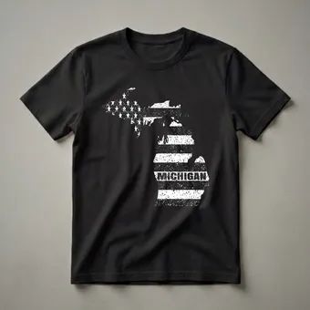 - Features a distressed American flag design within the Michigan state map.